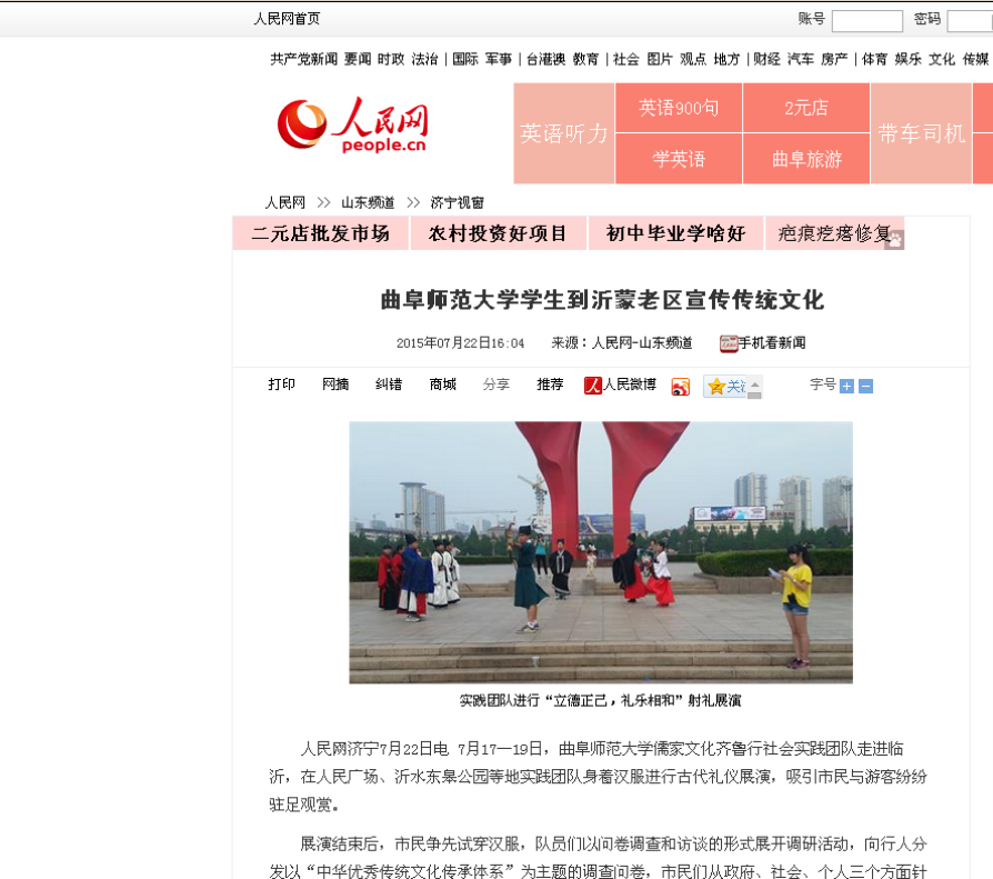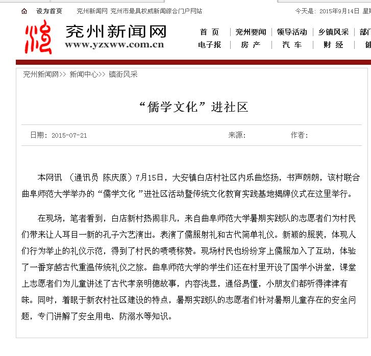在我校2015年大学生暑期“三下乡”社会实践活动中,大乐透 的“儒家文化齐鲁行”社会实践活动和“儒家文化”进社区活动引起了校内外媒体的广泛关注。人民网、齐鲁网等多家媒体对大乐透 “儒家文化齐鲁行”社会实践活动的开展以及实践团队的情况进行了相关报道,并给予了高度评价。