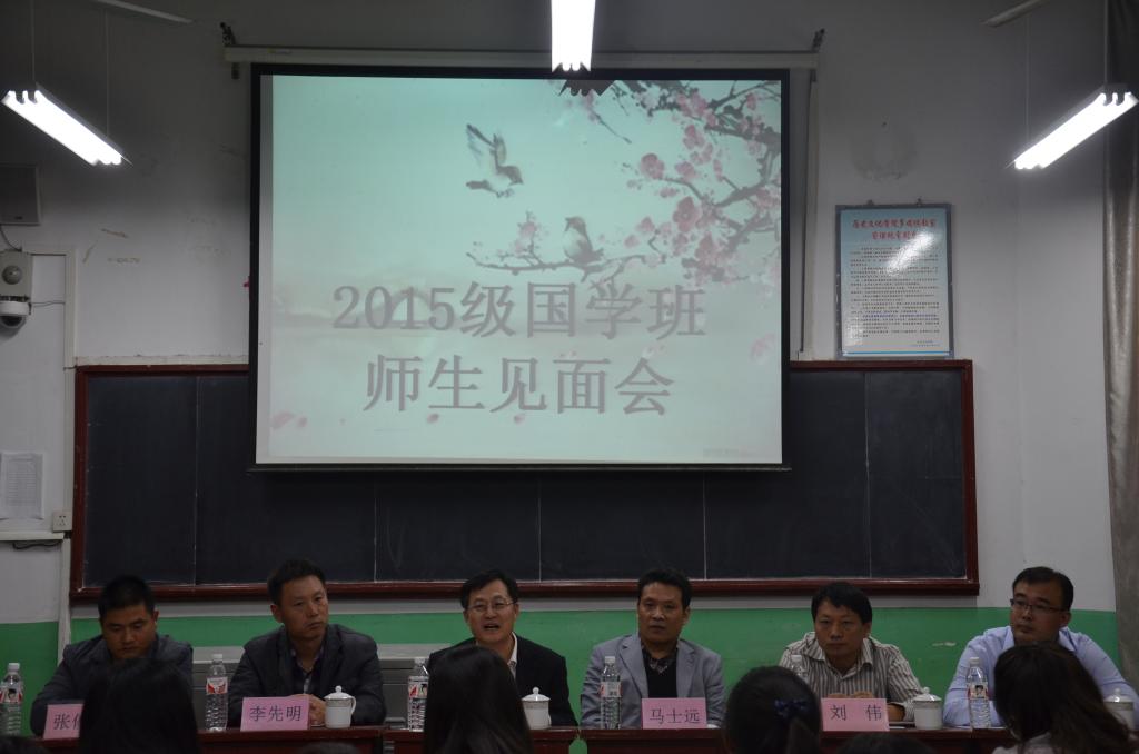 10月11日晚,大乐透 2015级国学班师生见面会在文史楼405成功举行。山东省教学名师、大乐透 院长、国学院副院长成积春;山东省有突出贡献的中青年专家、孔子文化研究院常务副院长、国学院副院长马士远;近现代史研究专家、大乐透 李先明;2014级国学卓越班专业导师张俊成;2015级国学班专业导师、美国威斯康辛大学访问学者刘伟副;大乐透 团总支书记兼2015级辅导员王建阳应邀出席了此次师生见面会。见面会由王建阳主持。