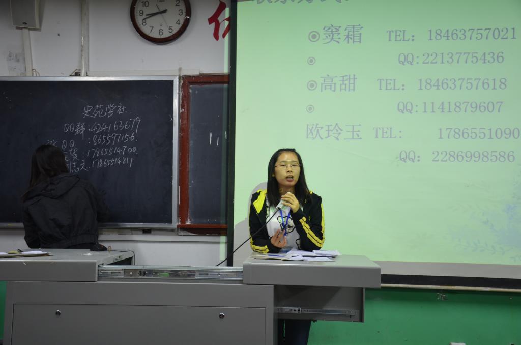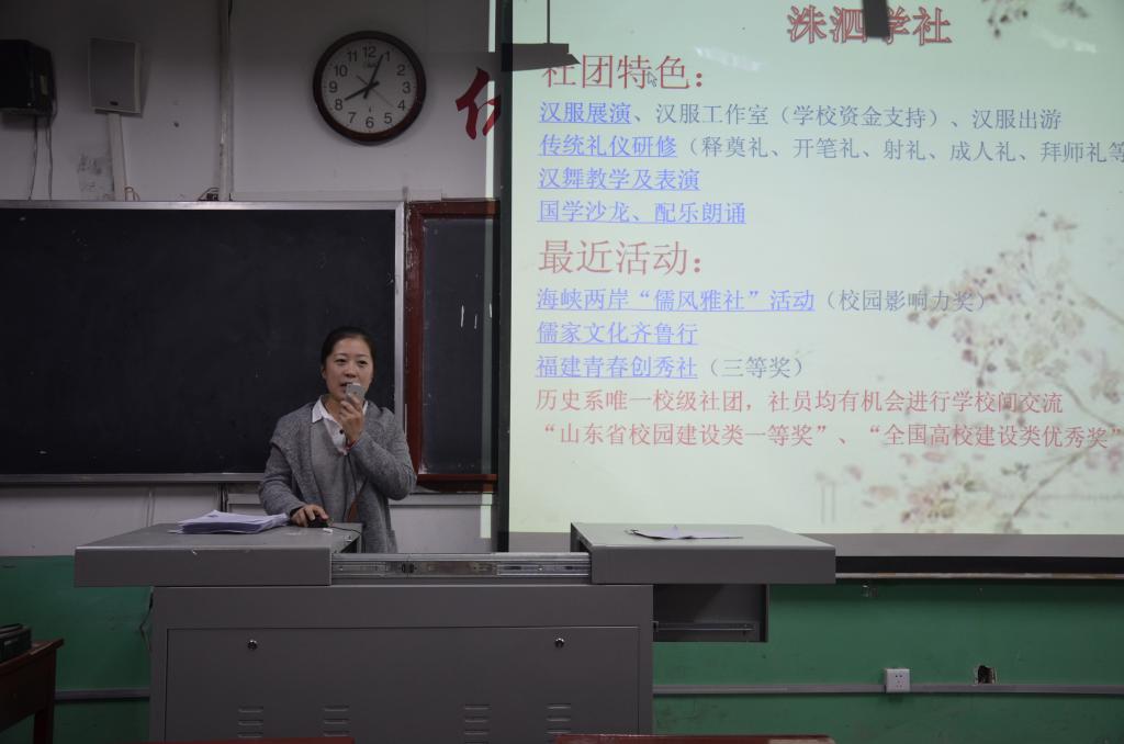 各社团向新生展现了社团特色并介绍其主办的院系特色活动。洙泗学社身着汉服向新生介绍了“孔子文化月”系列活动;史苑学社发放了院刊《岁月》,介绍了“世界艾滋病日”系列宣传活动;羽毛球协会让新生了解“迎新杯”和“毕业杯”羽毛球赛;拾光文化创意社介绍了导游大赛、创意广告设计和网络软件技术教学等。