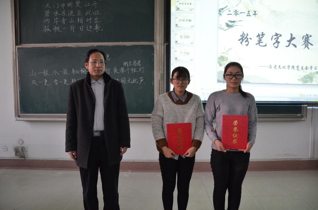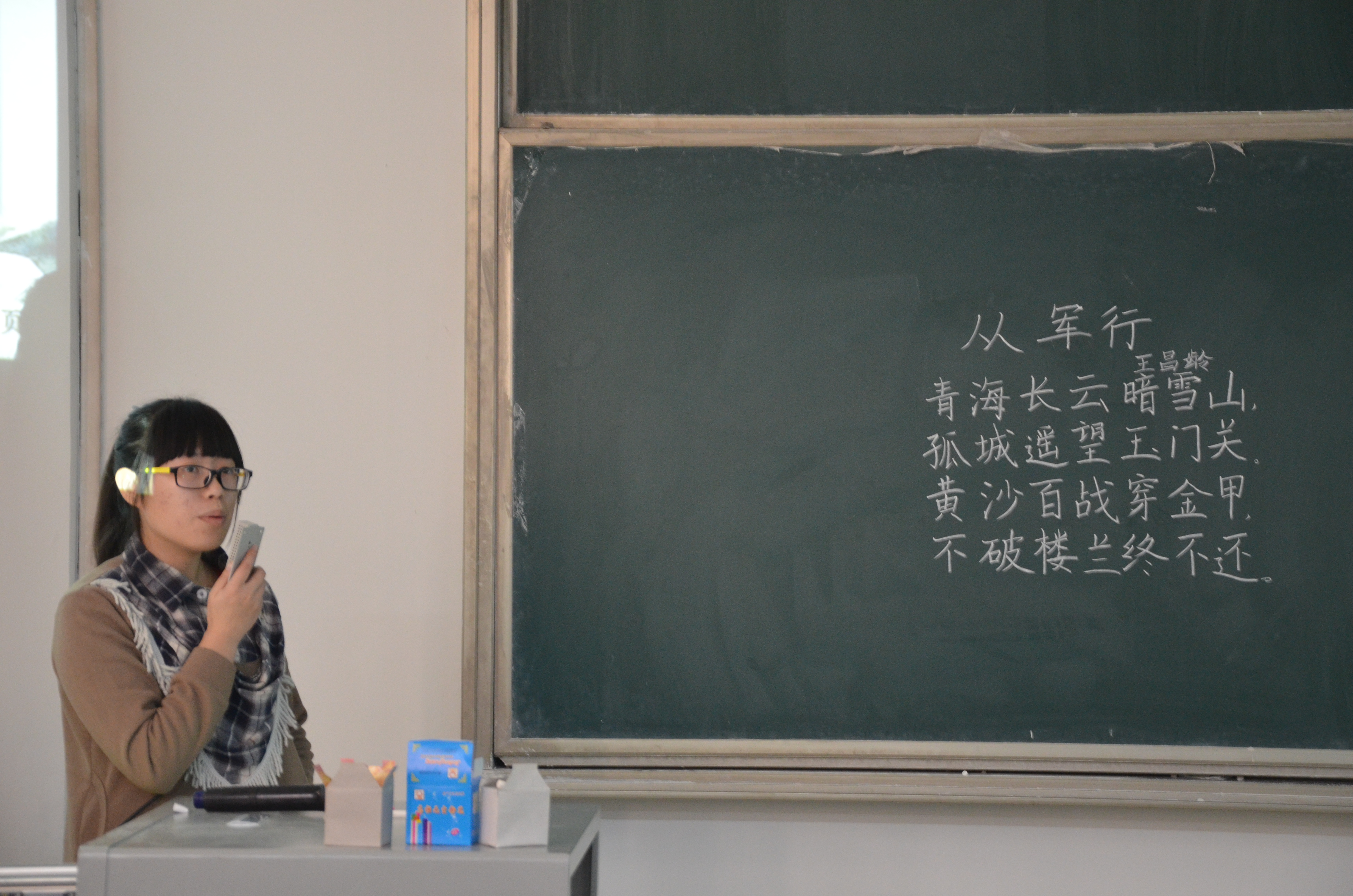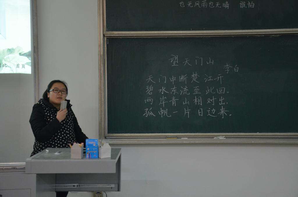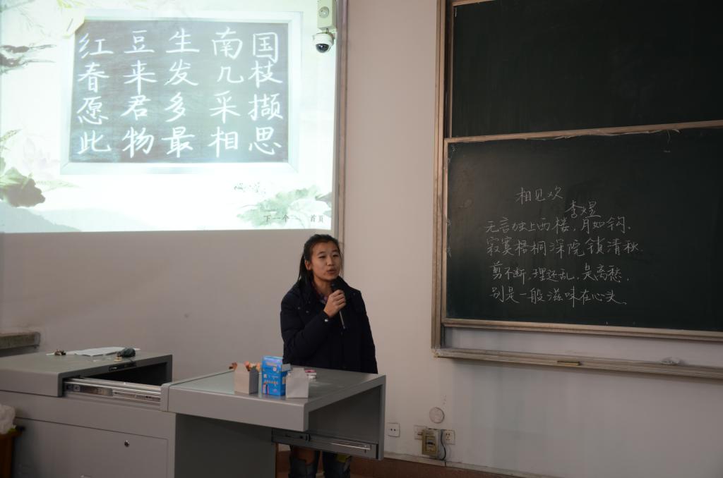 经过初赛和复赛的激烈角逐,共有16位选手晋级决赛。比赛共有现场展示我看诗文两个环节,在选手进行粉笔字书写展示的同时,大屏幕上将播放选手的PPT风采展示,后由选手对自己的作品内容、感受进行讲解。评委对选手两个环节的表现进行了打分,最后杨来舜老师从字体结构、章法布局等方面对选手们的作品进行了专业点评。最终,2015级王小梅和常嘉意获得了一等奖。