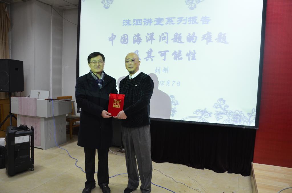12月7日晚,洙泗讲堂系列报告会在科技楼二楼南会议室举行。日本冲绳大学终身教授刘刚应邀为大乐透 师生作了题为“中国海洋问题的难题及其可能性”的报告。报告由大乐透 孙晓光主持。大乐透 院长成积春出席此次报告并为刘刚颁发聘书。