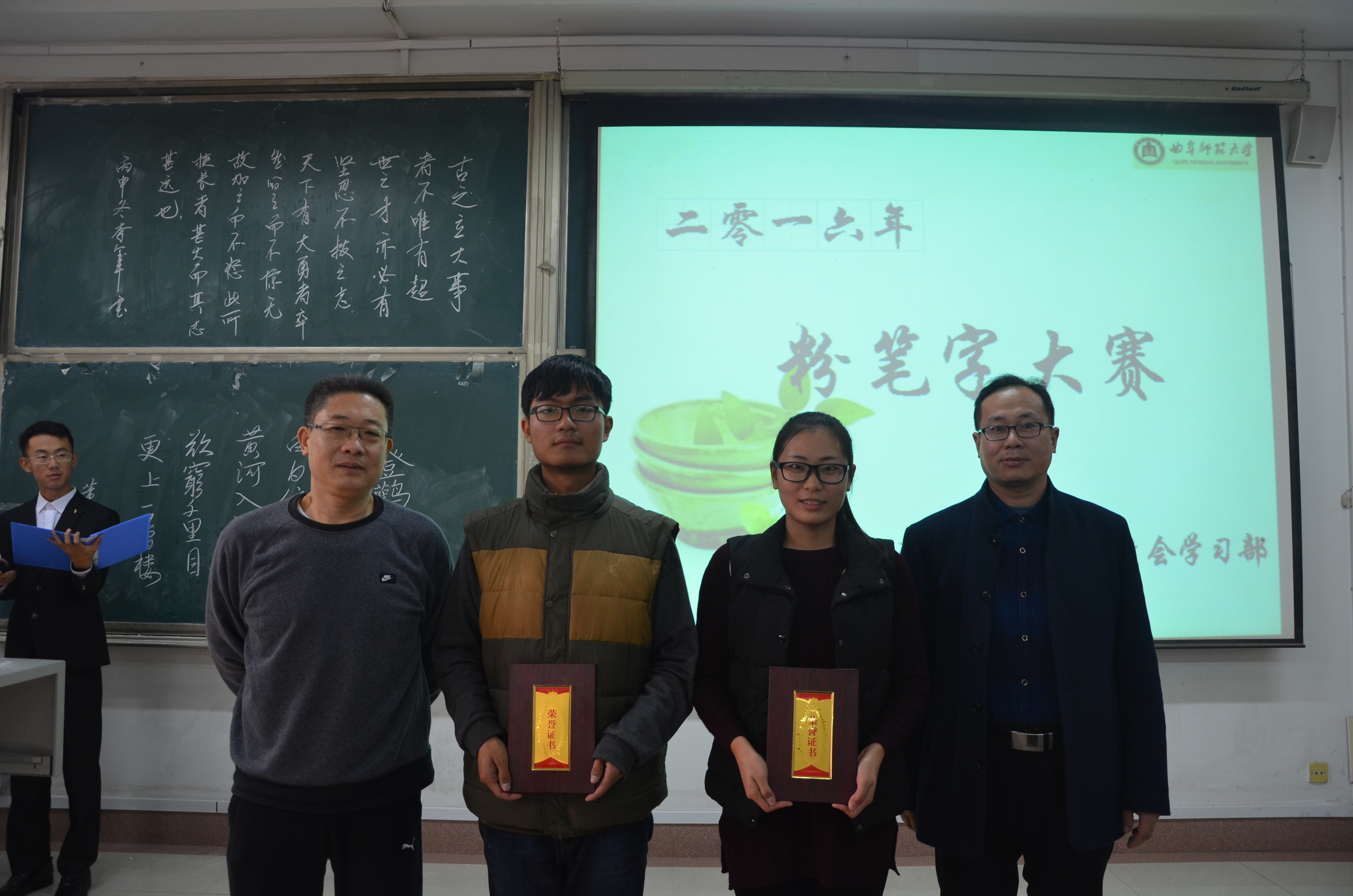 11月13日上午,由大乐透 团委主办的“2016年粉笔字大赛”在综合楼105落下帷幕。王连生老师、李春玲老师、江海云老师、韩锋老师出席了此次比赛并担任评委。