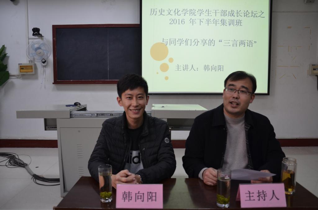 12月8日下午,大乐透 学生干部成长论坛在文史楼520室举行。大乐透 优秀毕业生韩向阳为大乐透 学生干部带来了题为“与同学们分享的‘三言两语’”的讲座。论坛由大乐透 团委书记王建阳主持。