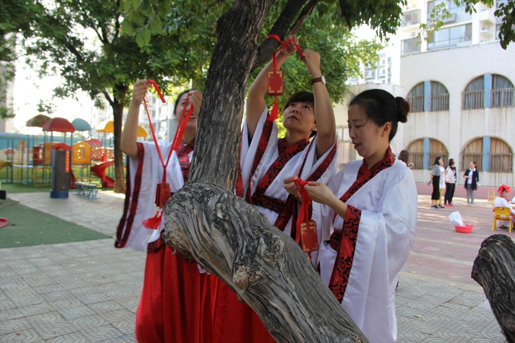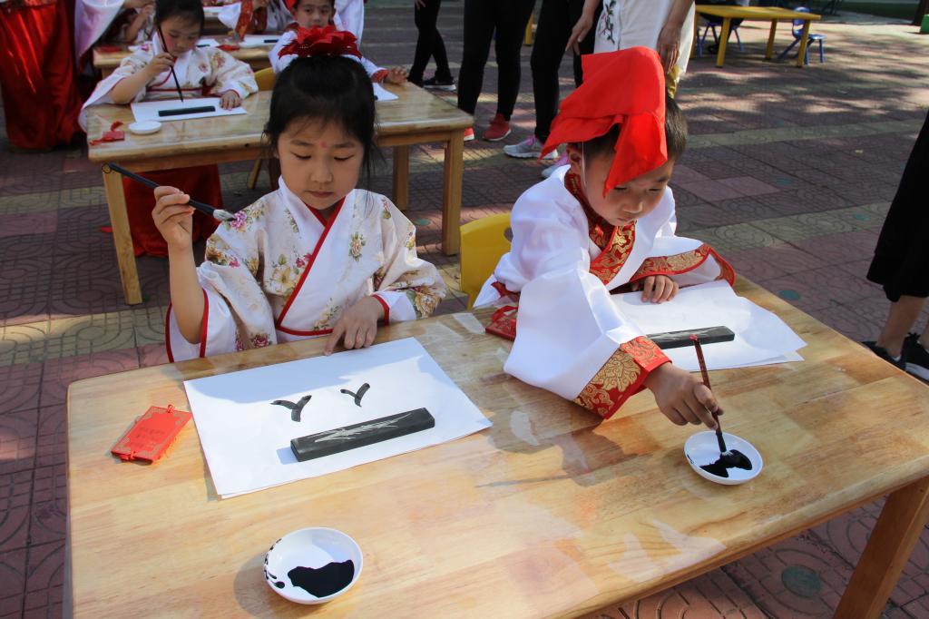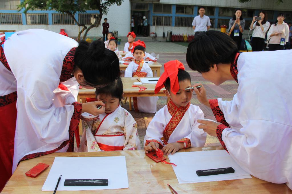 此次“开笔礼”活动共包括穿汉服,正衣冠、祭拜孔子、朱砂启智、击鼓明智、启蒙描红、诵读《三字经》以及封存心愿等主要环节。活动伊始,学童们在老师的带领下,庄重地整理好衣冠,向先师孔子行长揖礼。老师们用朱砂在学童们的额头正中点上红痣,意为开启智慧之门。随后,老师敲击益智鼓三声,以示学童从此启蒙。在老师的带领下,学童们用毛笔在纸上认真地写下“人”字,寓意在人生的启蒙阶段,学会做人是最为重要的。最后,老师们将写有学童美好愿望的许愿带系挂在树上,寓意学有所成、功过王侯。