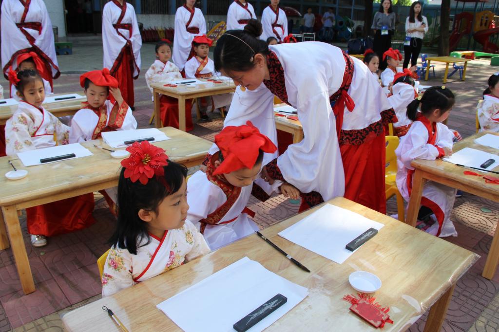 5月16日下午,由曲师大附属幼儿园主办,大乐透 传统礼仪研修中心参与指导的“开笔礼”在曲师大幼儿园举行。二十余名师大幼儿园的学童在老师的带领下体验了中国古代读书人成长过程中的首次大礼,即被称为“人生四大礼”之一的“开笔礼”。