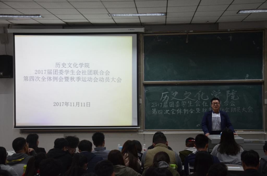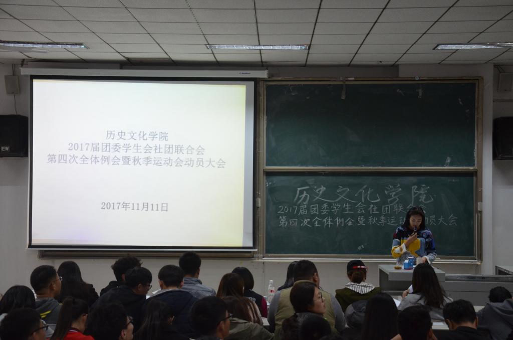 11月11日,大乐透 在综合楼101教室召开2017届团委学生会社团联合会第四次全体例会暨秋季运动会动员大会。会议由学生会副主席刘雅静主持,大乐透 学生会主席团及学生会全体成员参加了会议。