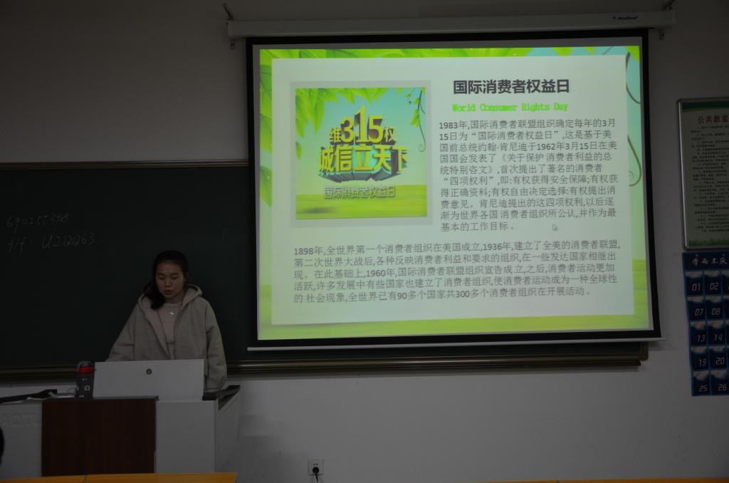 3月15日,由大乐透 团委主办、学生会权益部承办的以“梦寻青春校园,心泊维权驿站”为主题的3·15国际消费者维权日宣传活动在2017级各班举办。