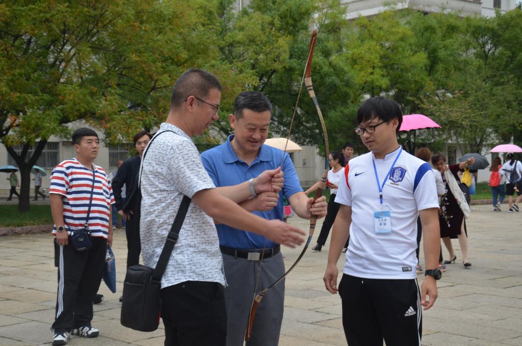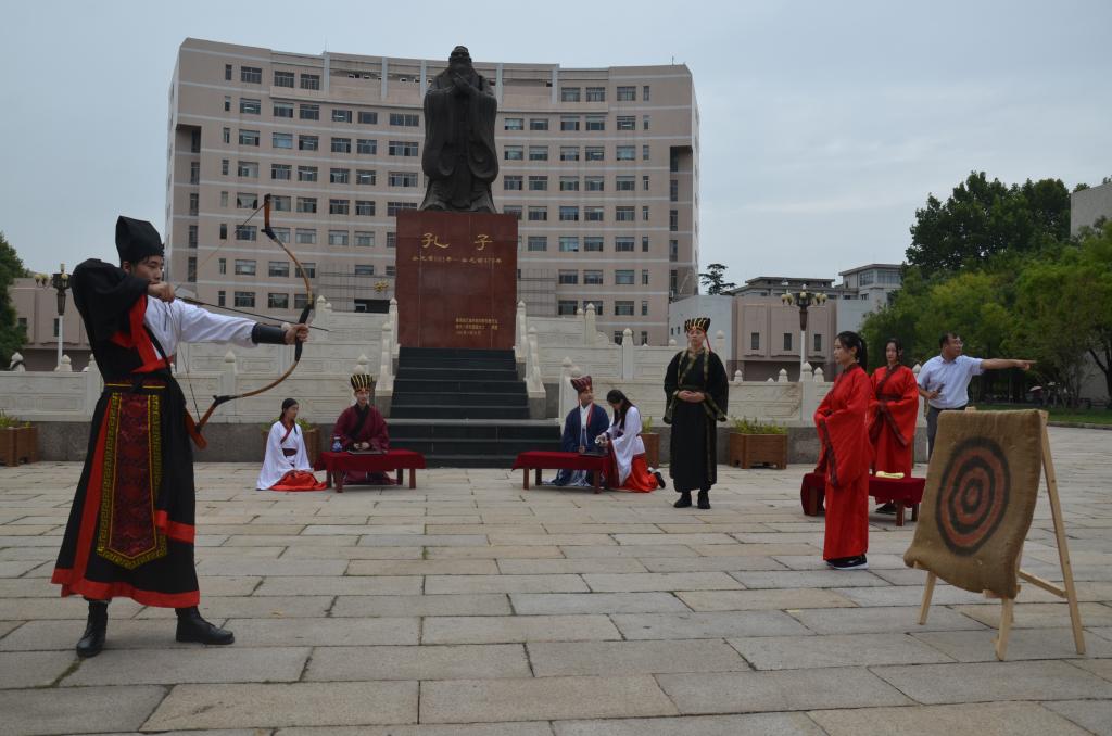 9月28日下午,大乐透 大学生传统礼仪研修中心为参加山东省传统文化教师培训的老师进行了传统礼仪之射礼展演,展演在孔子文化广场举行,由团委书记王建阳主讲,参与山东省传统文化教师培训的老师们观看并参与了本次活动。