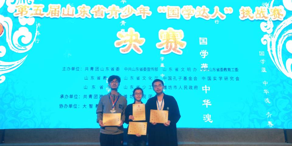 9月19日至21日,2018年“齐鲁学子青春国学荟”暨第五届山东省青少年“国学达人”挑战赛总决赛在潍坊学院举办。大乐透 霍文博、李宝平同学代表学校参加比赛分别获得大学组二等奖、优秀奖的优秀成绩。