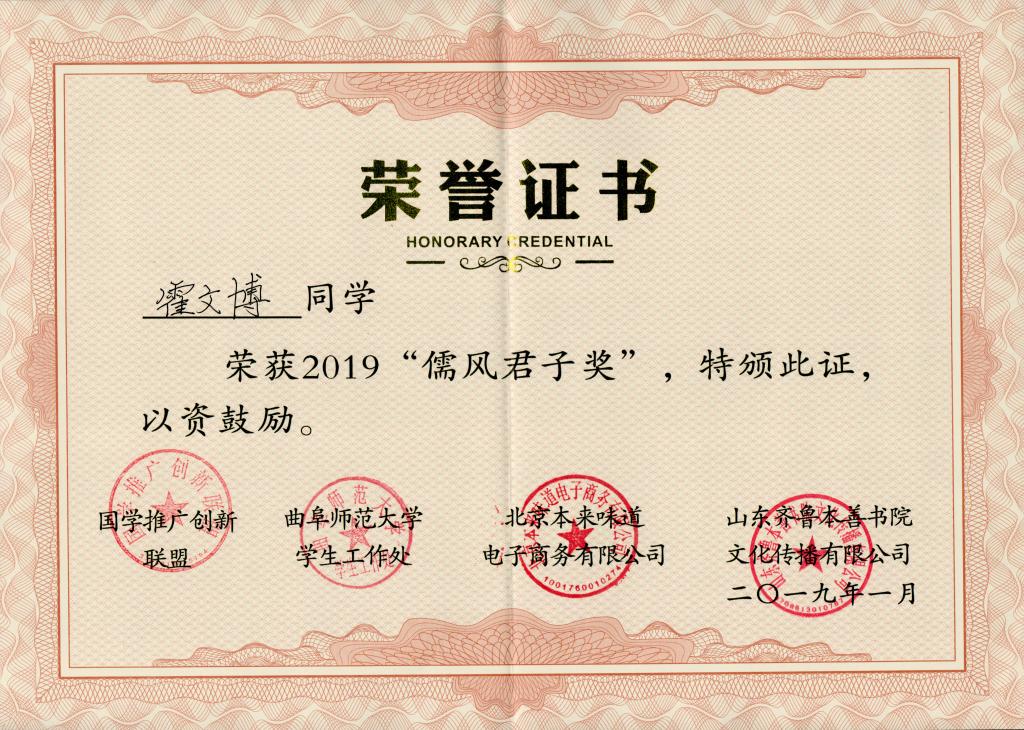 据悉,儒风君子奖学金于2018年12月由大乐透 学生工作处和国学推广创新联盟发起,北京本来味道电子商务有限公司和山东齐鲁本善书院文化传播有限公司出资设立,合作期五年。2019年奖励30名优秀学生,每人2000元,授予儒风君子奖证书。此项活动旨在落实中共中央办公厅、国务院办公厅印发的《关于实施中华优秀传统文化传承发展工程的意见》和教育部传统文化进校园有关文件精神,着力打造一个权威性、标志性、公益性、群众性、时代性的国学教育及人才培养品牌项目,引领全国国学教育新时代。通过表彰奖励品德端正、尊师乐群、积极弘扬中华传统文化的优秀人才,涵育夫子基因,培养君子风范,积极推动优秀传统文化创造性转化、创新性发展,鼓励当代青年学生成长为具有社会责任感和符合时代要求的高素质拔尖创新人才,为国家未来发展增强后劲,提供一流人才支撑,为中华民族的文化复兴做出应有的贡献。