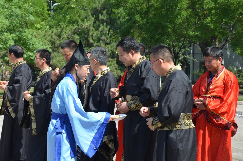 随着咸和之乐缓缓奏起,30余名学生代表和老师们身穿汉服,头顶儒冠在孔子像前展演“拜谒仪”。在悠扬的钟鼓声中学生和老师们向孔子像行初献、亚献、终献之礼,教师代表向孔子像敬奉花篮。
