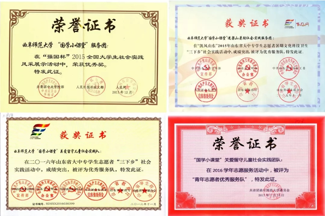 据悉,国学小课堂是由大乐透 团委组织开展的以“弘扬优秀传统文化、关爱留守儿童”为主旨的志愿服务项目活动。本项目以传统文化为主线,采用志愿者国学授课和大学生村官励志心理辅导相结合的思路,形式上采用快板、历史情景剧、评书等喜闻乐见的方式进行。内容上,团队会因地制宜根据当地的传统文化特色,确定国学教授的具体内容,将宣传传统文化与关爱留守儿童完美结合。自2015年开始至今,“国学小课堂”已在梁山、邹城和临沂等地建立了八个实践基地,多次荣获山东省“三下乡”活动“优秀服务队”称号,2018山东省青年志愿服务项目大赛银奖,多次被评为校级“优秀社会实践团队”。