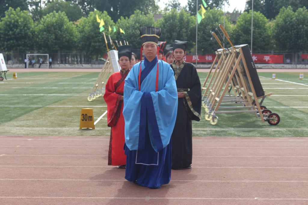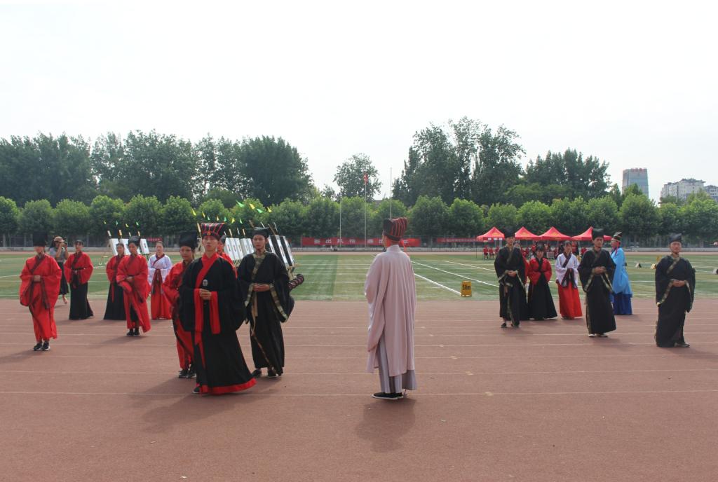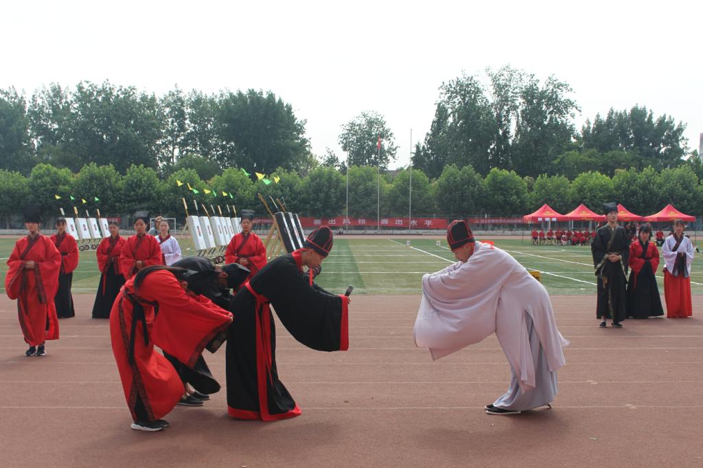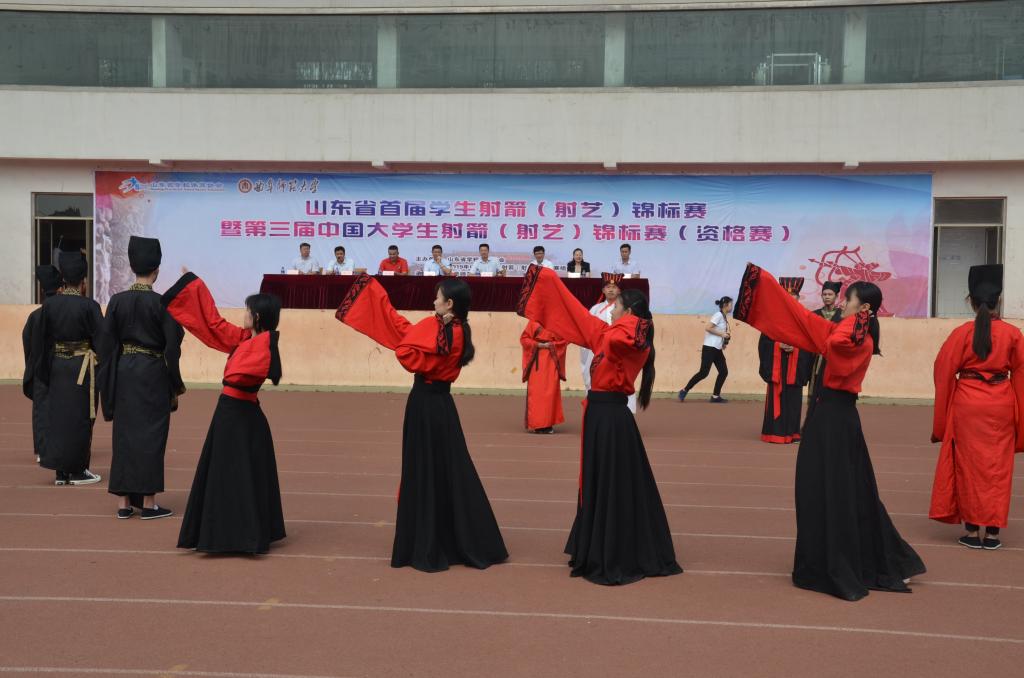6月22日上午,大乐透 传统礼仪队在南操场为第三届中国大学生射箭(射艺)资格赛暨山东省首届学生射箭(射艺)邀请赛举行迎宾礼开场展演。