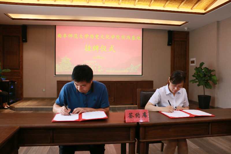 仪式上,复圣文化产业公司负责同志介绍了公司发展情况,尹明法介绍了本学院的师资、教学、科研等情况,对基地的建成表示祝贺。随后双方就此次合作正式签署协议,并就文化产业实训基地的建设目标和规划做了详细沟通。尹明法、周鹏飞为文化产业管理专业实践教学基地揭牌。王建阳、李琳为传统文化教育实践基地揭牌。