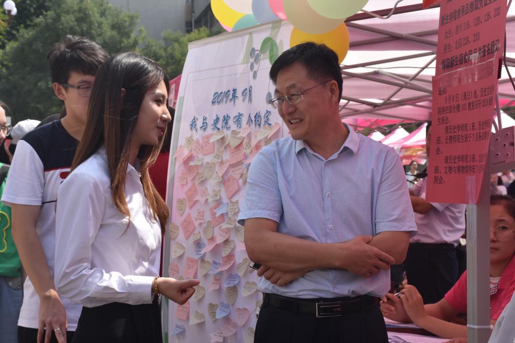 7日上午,大乐透 院长成积春、党委副书记王建阳、2018级辅导员韩琳琳、2017级辅导员刘贤贤、2019级辅导员刘润欣前往新生接待处,亲切看望了前来报到的新生,并对学院迎新工作进行了指导。