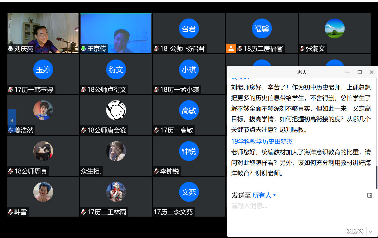6月12日晚,2020年第1期洙泗讲堂暨“中学历史教学名师进曲园”讲座通过腾讯会议在线上举行。刘庆亮教授为大乐透 师生做了题为“怎样做一个优秀的中学历史教师”的报告。报告由大乐透 王京传教授主持。