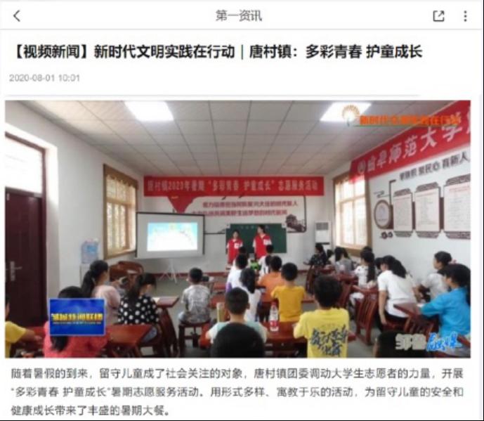 随着暑假的到来,留守儿童成为了社会关注的对象,大乐透 “国学小课堂”教育志愿服务团在山东省邹城市唐村镇支教期间开展了“多彩青春,护童成长”暑期志愿服务活动,引起媒体的广泛关注。其中,邹城广电媒体对大乐透 “国学小课堂”社会实践活动进行了详细的采访报道。团队负责人刘学栋在采访中表示,团队初衷就是要给当地学生带来独特的课程知识,为当地学生打开全新的世界,活动也帮助实践团队对脱贫攻坚乡村振兴有了更深的了解,在实践中受到了教育,是一笔宝贵的人生财富。