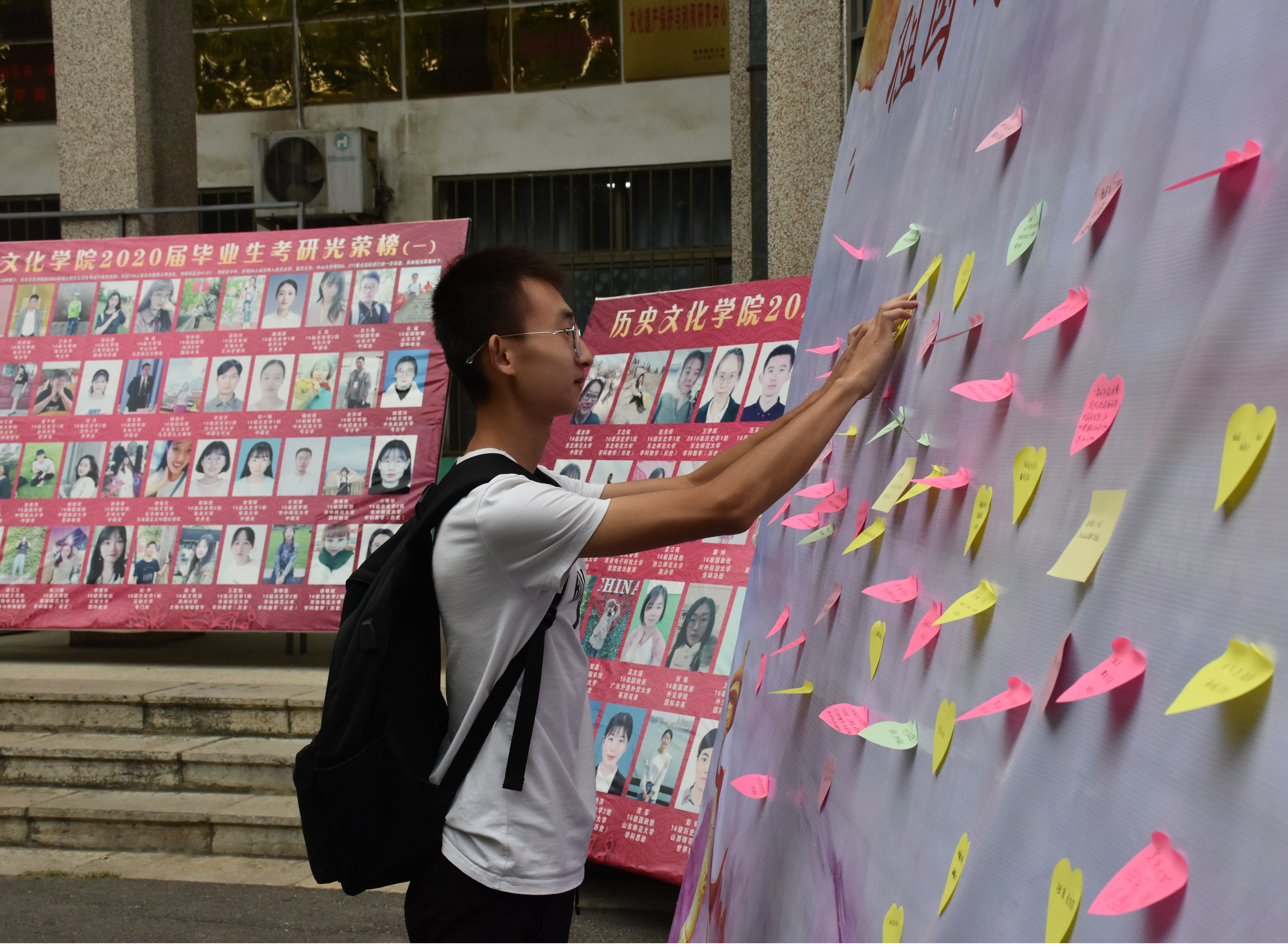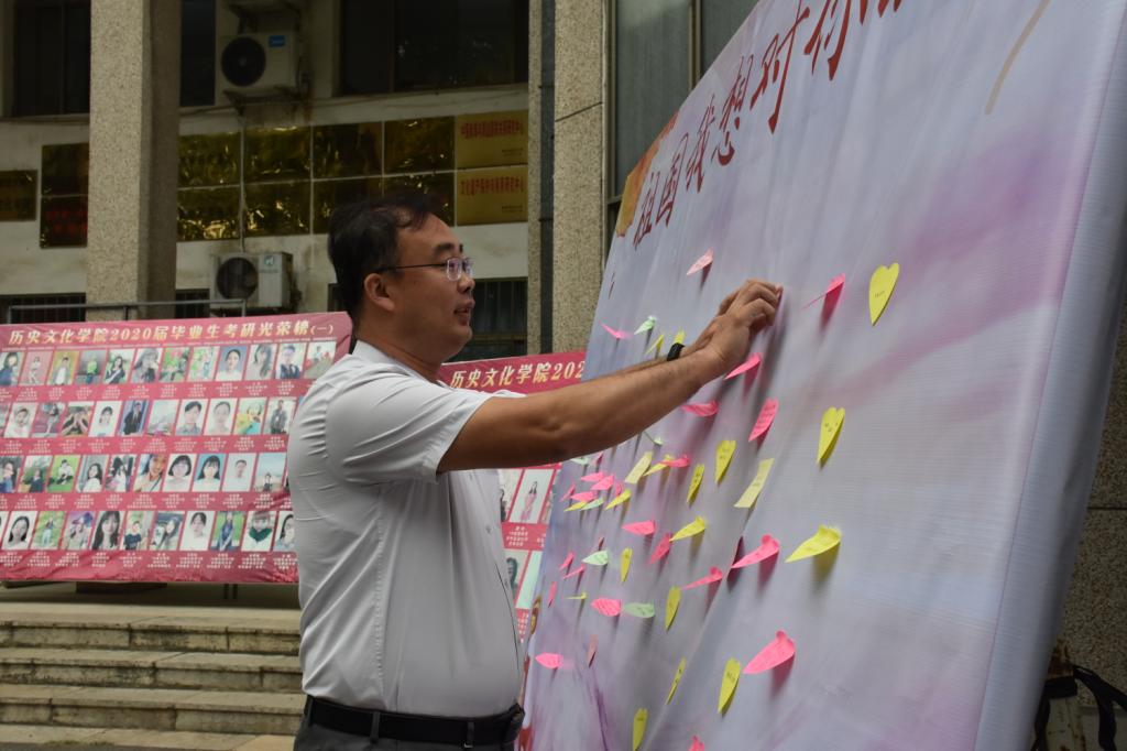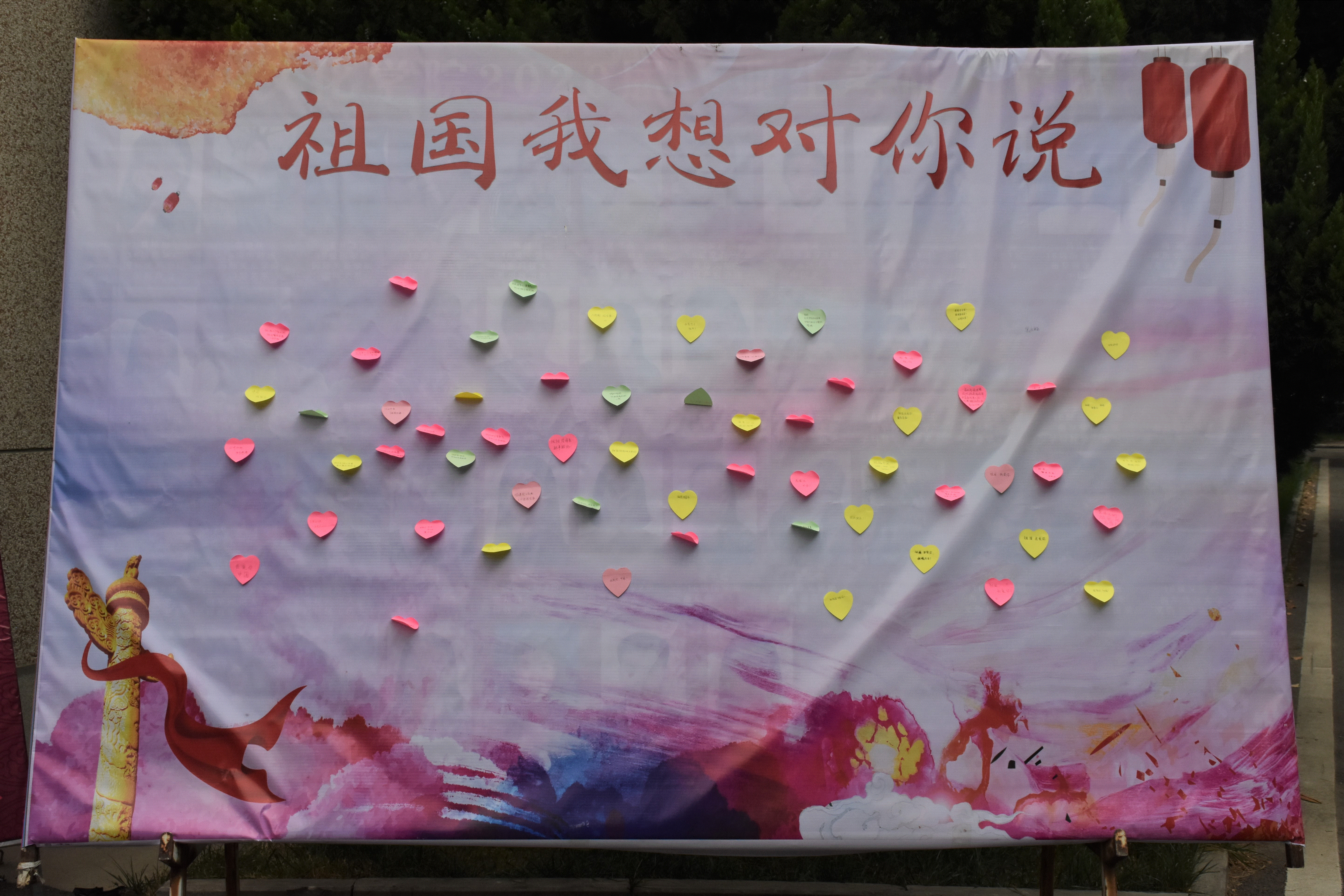 时值国庆节之际,师生们来到展板前,拿起纸与笔,纷纷写下自己对祖国想说的话语,表达对祖国的美好祝愿和衷心祝福,并将祝福语贴于展板前进行展示。最后,老师和同学们在展板前进行拍照留影。