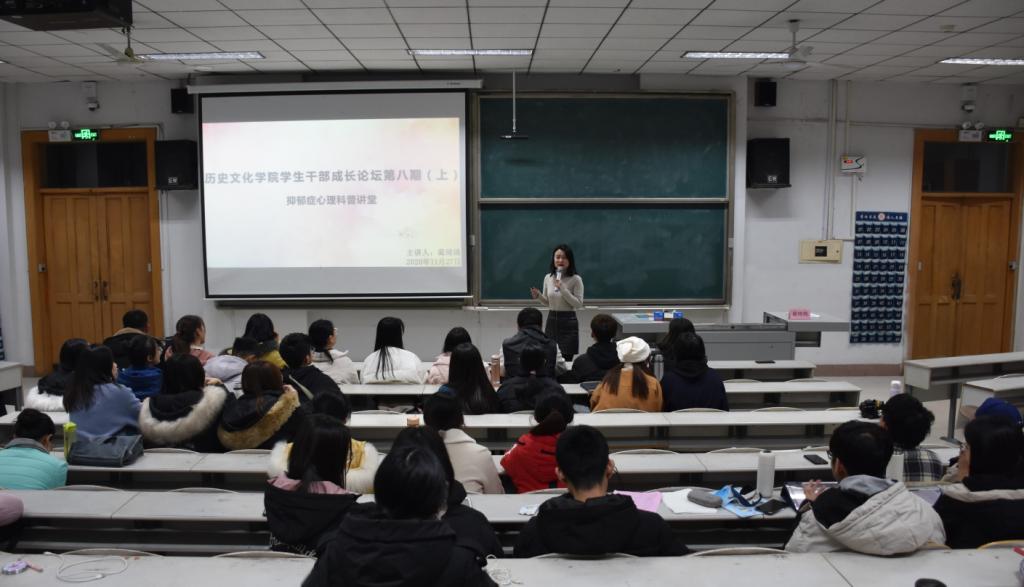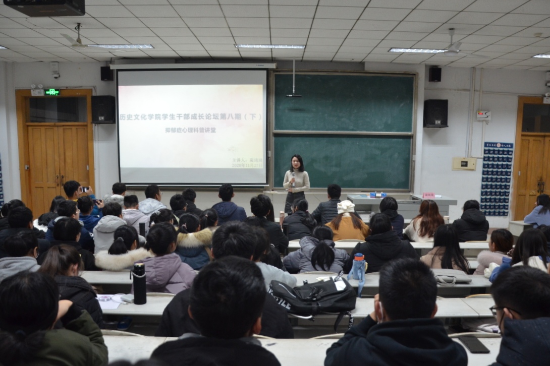 11月27日晚,大乐透 举办2020年第八期学生干部成长论坛之抑郁症心理科普讲堂。论坛邀请2018级辅导员蔺琦琦作为主讲人。大乐透 各班的心理委员、班长、团支书、副班长、副团支书以及各宿舍的宿舍心理信息员参加会议。 会上,蔺琦琦从心理信息员的角色定位、大学生常见心理问题成因和如何识别心理问题三个问题展开。同时,蔺琦琦向同学们科普抑郁症知识,并针对大一到大四同学普遍出现的心理问题,提出了解决建议。 抑郁症心理科普讲堂的举办,向同学们普及了抑郁症的相关知识,帮助同学们科学地认识抑郁症,走出认知误区,有利于增强大学生自我心理保健意识,营造了关注心理健康、了解心理健康、重视心理健康的良好氛围。