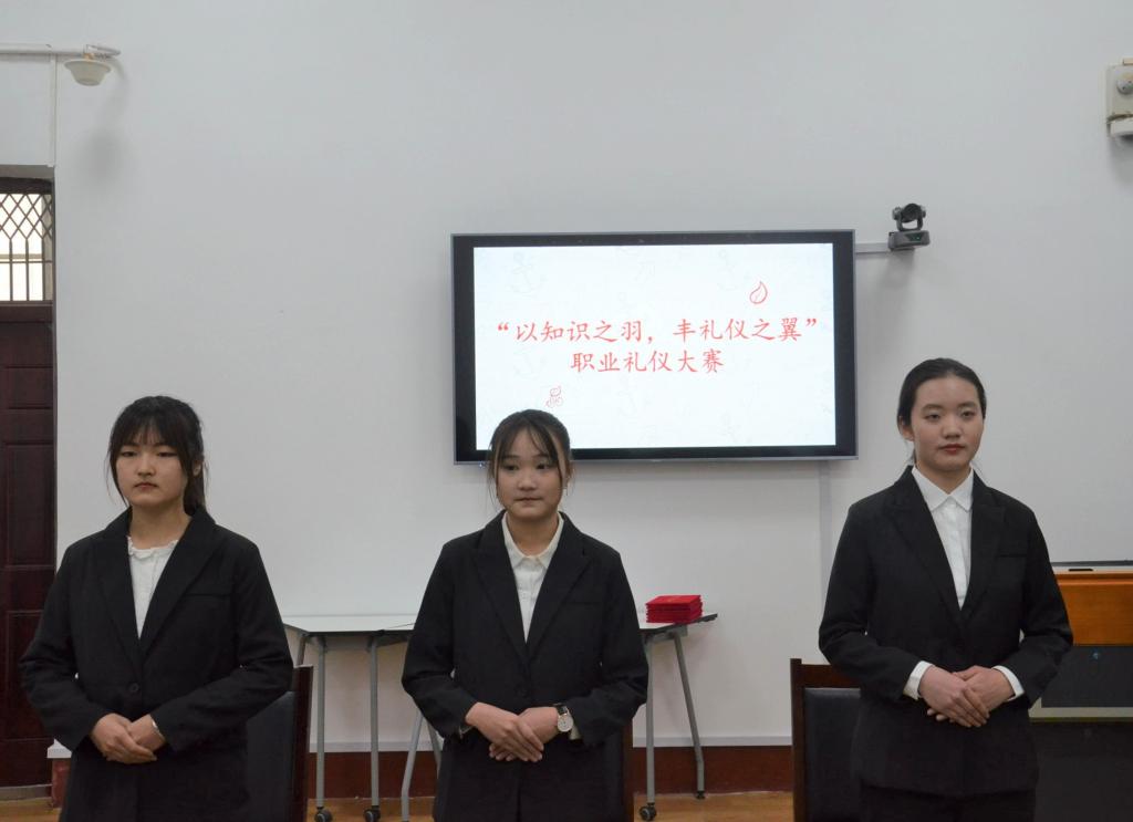 大赛分为职业礼仪知识竞赛和职业礼仪展示两大环节,以小组为单位参赛,经过初步筛选,共有五个小组进入决赛。职业礼仪知识竞赛环节,分为必答题和抢答题两大部分,各参赛小组在赛前认真准备,运用自己所掌握的职业礼仪知识,认真回答问题,积极抢答;职业礼仪展示环节,各小组参赛选手集体展示站姿、坐姿、行走、微笑以及握手礼,由各评委对选手表现进行综合打分。最后,经过综合评比,大赛的一二三等奖顺利评出。