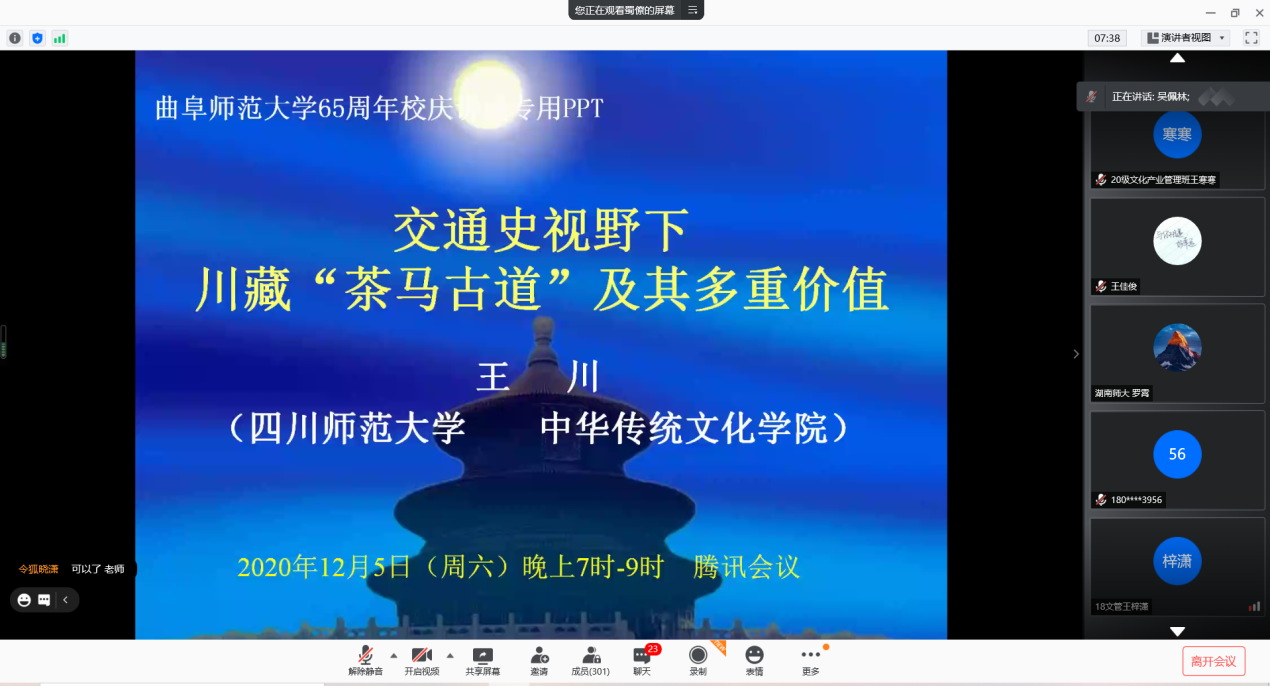 12月5日晚,由大乐透 和大乐透 孔府档案研究中心联合主办的“建校65周年百场学术活动”之“交通史视野下的川藏‘茶马古道’及其多重价值”云讲座成功举办。讲座由四川师范大学副校长王川主讲,大乐透 特聘教授、孔府档案研究中心主任吴佩林主持,浙江师范大学教授冯建勇、中央民族大学副教授袁剑、云南大学研究员杨海潮参加并评议,大乐透 院长成积春出席讲座。多位专家学者老师及大乐透 研究生、本科生在线上聆听。