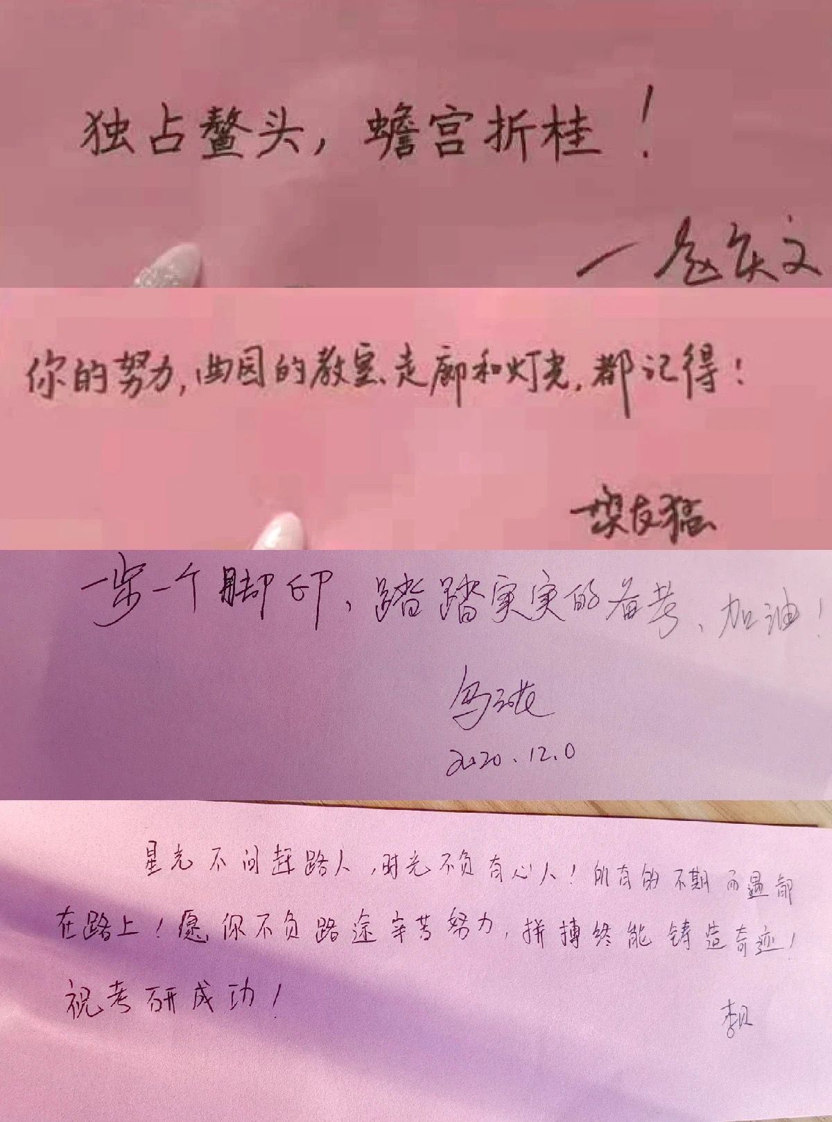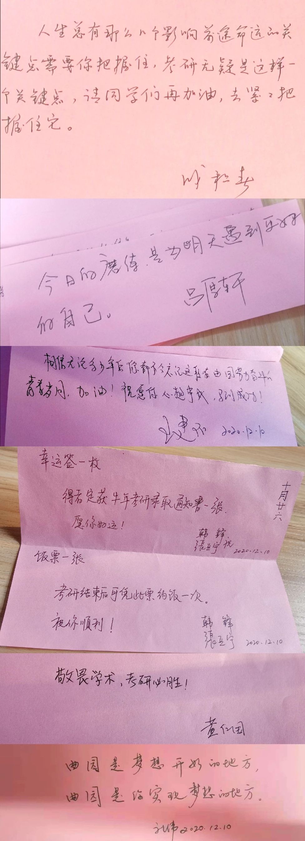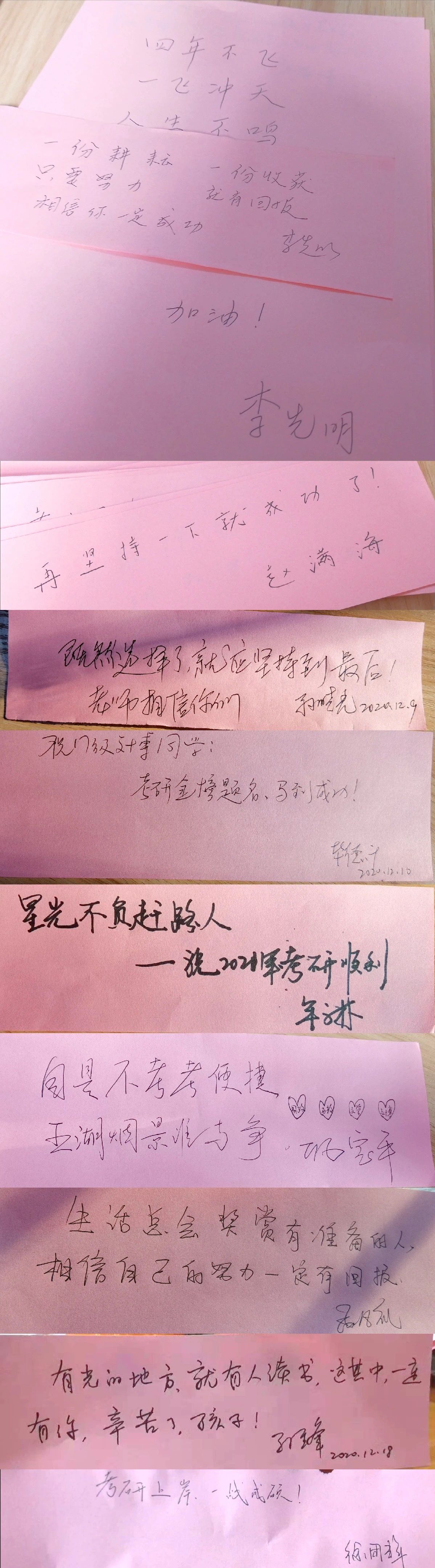 穿梭书海勤为舟,苦中作乐亦心欢。学院老师为考研学子送去温暖与祝福,让同学们感受到学院的关怀与期望,增强考研学子备战的信心与勇气,帮助同学们以最好的精神状态迎接考试。祝愿每一位考研学子旗开得胜、金榜题名!