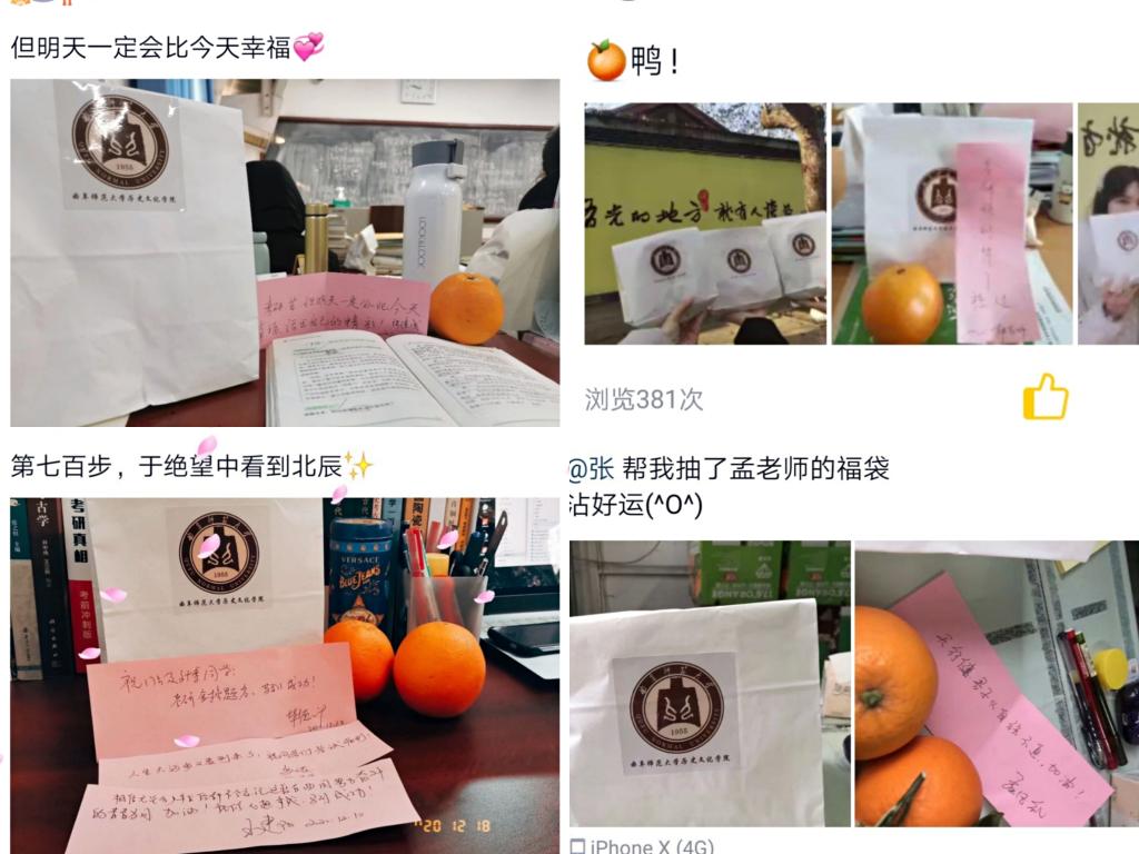 学院老师纷纷为考研学子写下代表祝福的寄语卡片,鼓励同学们付出就会有收获,要增强自信、不留遗憾地积极进取,并预祝同学们不负众望、马到成功。随后,老师们和学生代表将寄语卡片和具有学业有“橙”、心想事“橙”等寓意的橙子装入“考研祝福礼袋”中,代表学院将“考研祝福礼袋”分发给考研学子,并为他们加油打气。这一份份充满温暖的礼物,令正处在紧张备考状态的考研学子们感受到了来自学院的关怀与爱。同学们收到“祝福礼袋”后,纷纷向老师表示感谢,表示一定尽最大努力积极备考,并对接下来的考研充满信心。