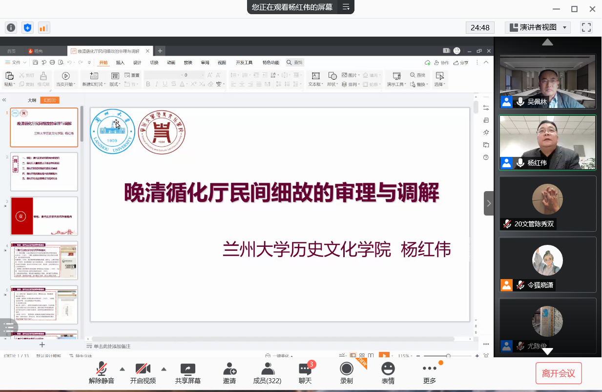 12月20日晚,由大乐透 和大乐透 孔府档案研究中心联合主办的“建校65周年百场学术活动”之“晚清循化厅民间细故的审理与调节”云讲座成功举办,该讲座由兰州大学萃英学者、博士生导师,兼任中国经济史学会副秘书长、中国现代史学会理事、教育部历史教学指导委员会委员,教育部哲学社会科学重大课题攻关项目“清朝循化厅民族司法档案整理与研究”首席专家杨红伟教授主讲,大乐透 特聘教授、孔府档案研究中心主任吴佩林主持。