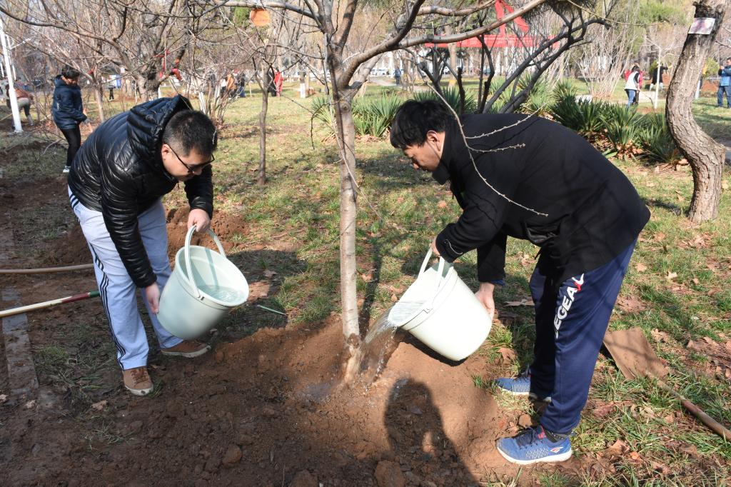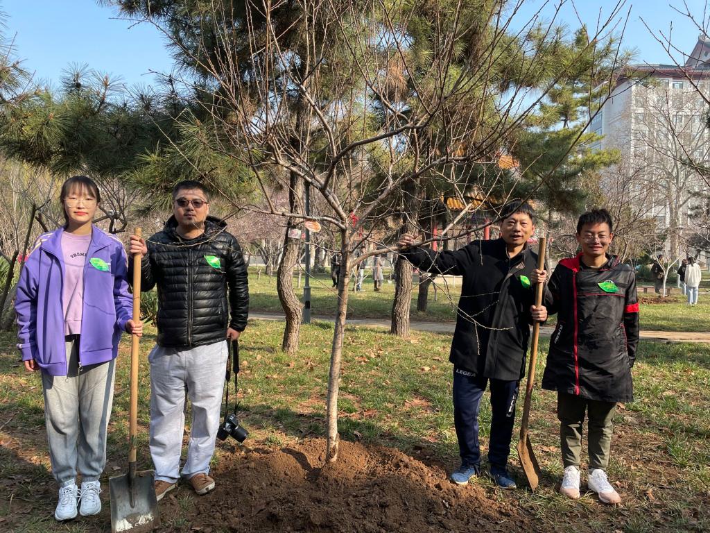 当天上午9点,参加植树活动的教师代表刘伟老师、续大鹏老师和学生代表江彤菲同学、徐润泽同学,在工作人员带领下领取树苗后,立即在桃李园开始植树活动。师生分工明确,相互配合,共同植树。树苗栽种完毕后,老师与同学们共同挂上了象征大乐透 的标识牌。