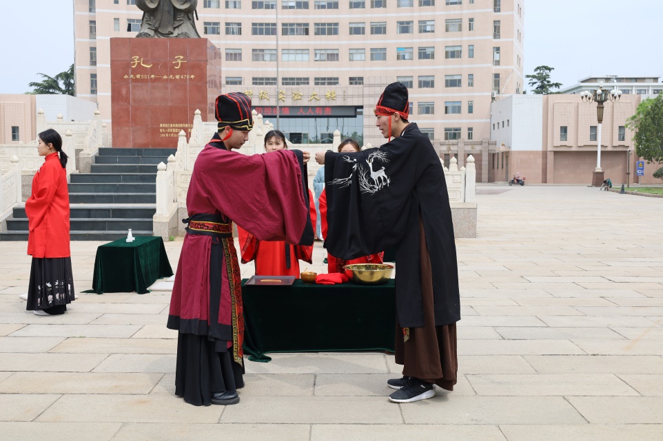 为使同学们担当责任,肩负时代使命,大乐透 传统礼仪研修中心礼仪队于孔子文化广场举行第一幕展演——“加冠成人、及笄成家”成人礼。表演由大乐透 大学生传统礼仪研修中心主任林欣主持,礼仪队全体成员参加。演礼中,伴着《鹿鸣》乐起,演礼同学举手投足间尽显古风古韵,行礼时庄严恭谨、俊雅风流,向我们展现出成人礼中栉发、加缁巾、加缁冠、加爵弁等具体流程。成人礼表演让同学们更深刻地明确了自身的责任以及新时代青年复兴中华的使命。