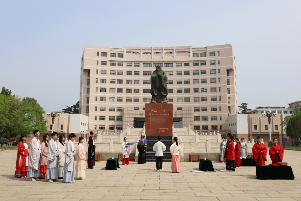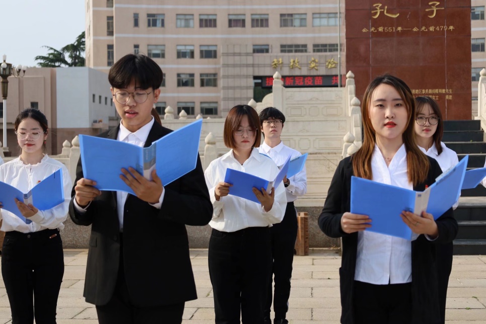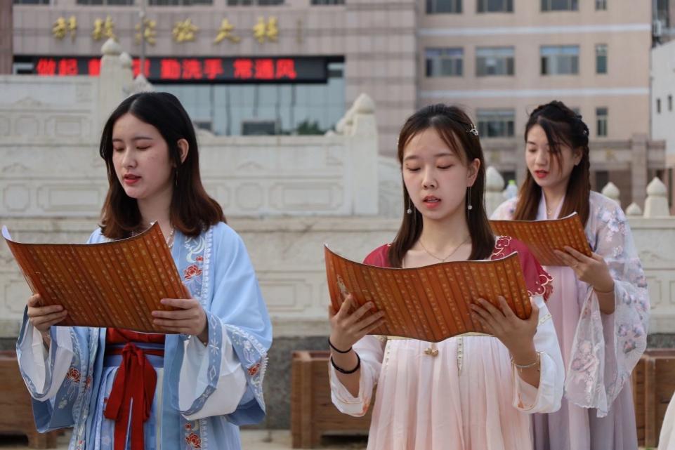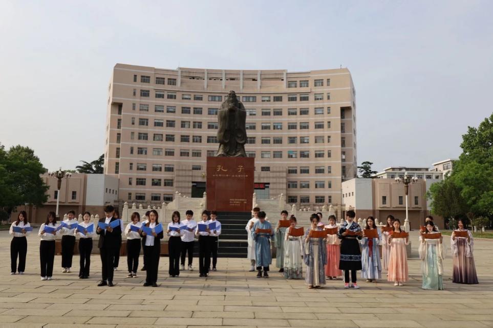 为使同学们蓬勃奋发,展现中华风采,大乐透 儒马会通社团于孔子文化广场中央举行第三幕展演—— “青衿之志,履践致远”诵读。一侧方队汉家衣裳,中华之美,一侧方队西装革履,庄重严肃,同学们通过古今对话形式的诵读,追忆了党史的发展历程,将儒家传统文化与五四青年精神融合为一体。诵读表演让同学们更清楚地了解到中国古今变化,激励了同学们为中华复兴贡献出自己的一份绵薄之力。