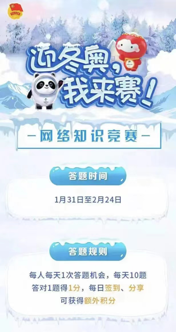 为抓住2022年北京冬奥会契机,进一步落实《关于面向全国大学生团员组织开展“青春爱运动健康强中国”全民健身活动的通知》要求,共青团中央青年发展部、国家体育总局群众体育司、中国青年报社、中国青年网联合推出“迎冬奥,我来赛!”网络知识竞赛活动。1月31日-2月24日期间,大乐透 积极组织学生参加网络知识答题竞赛。