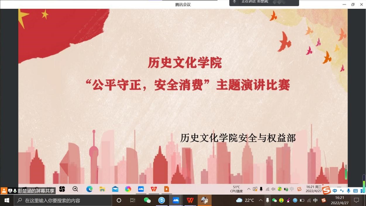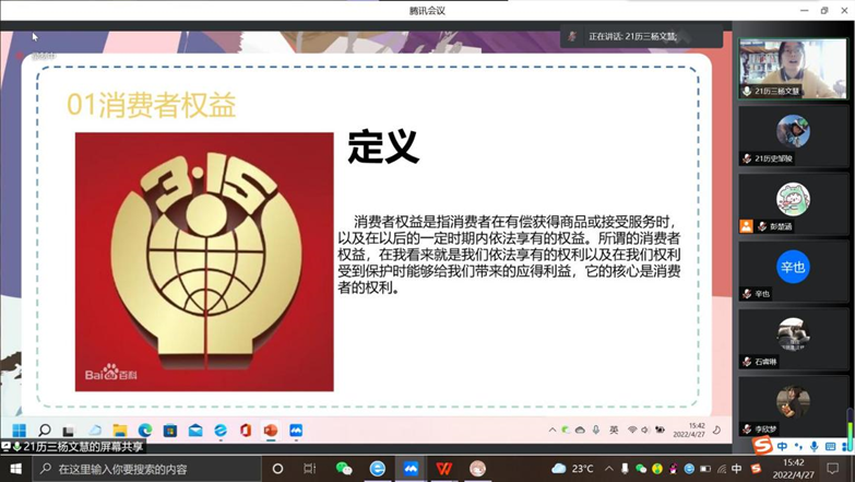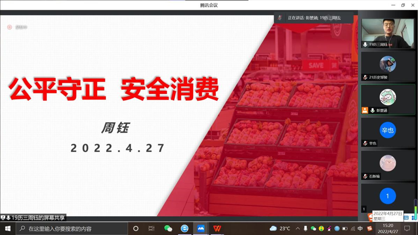 为普及维权知识,提高大学生维权能力,协助学校开展“百年庆团际,维权携吾力”主题活动,4月27日,大乐透 安全与权益部面向大乐透 全体同学于在腾讯会议组织开展线上“公平守正,安全消费”主题演讲比赛。