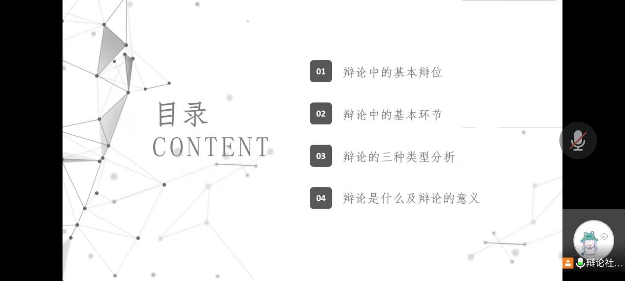 本次培训会通过腾讯会议线上举办,辩论社社长杨萧蓥为大家讲解辩论中的基本辩位、基本环节、辩论的三种类型分析、辩论是什么以及辩论的意义等辩论知识,组织社员观看了经典辩论桥段。同学们也都积极参与到辩题的讨论中去,在语言的交锋中阐释自己的观点,培训会最后在同学们的不断交流中落下帷幕。