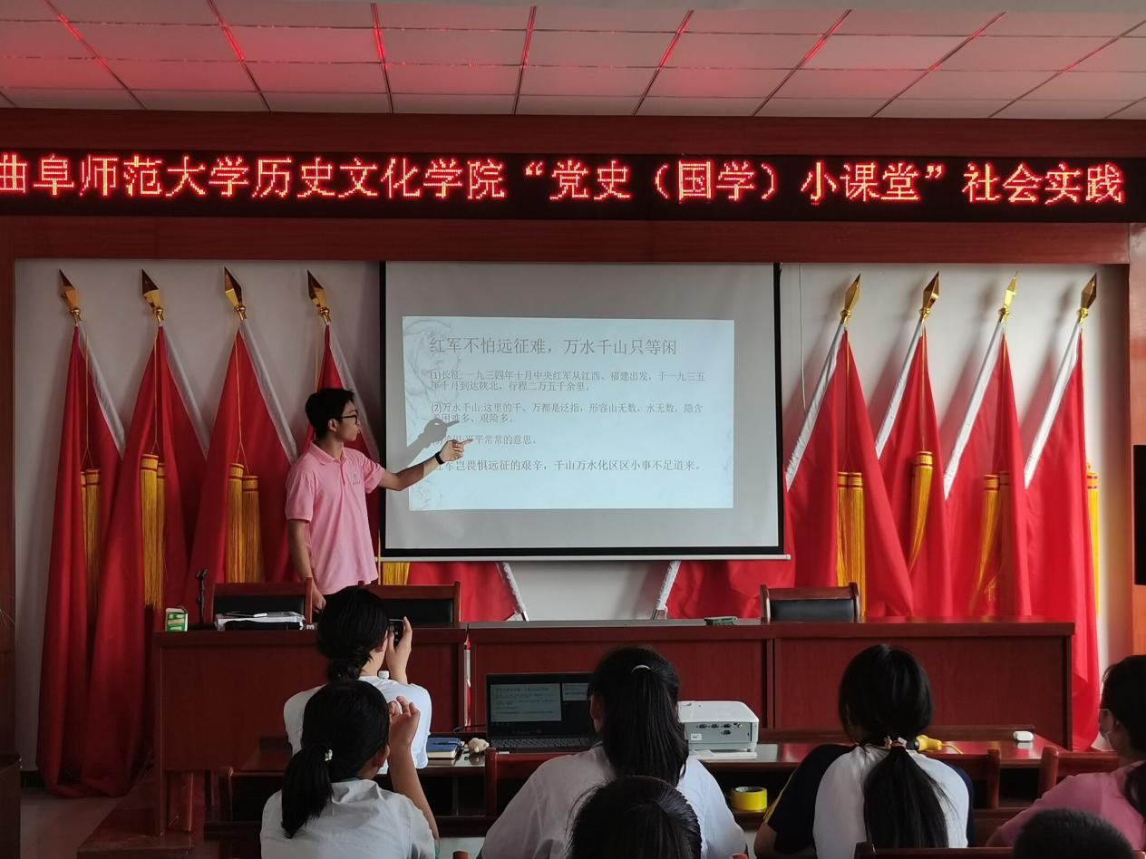 团队志愿者结合当地学生的实际情况,发挥历史学特长,围绕党史主题开展了“学唱红歌《强军战歌》”,“红色经典诵读《强军战歌》”,“重走百年党史路”讲解课,“演讲比赛:我心中的党史人物”等特色主题活动。志愿者们在宣讲党史内容的过程中,通过提问的形式普及党史知识,学生们积极讨论,互相学习,踊跃回答。同时,本着“寓教于乐”教育理念,还增设观看党史影片、主题绘画等活动让学生们更生动形象地了解革命党史,使学生们的爱国情怀进一步内化于心,外化于行。