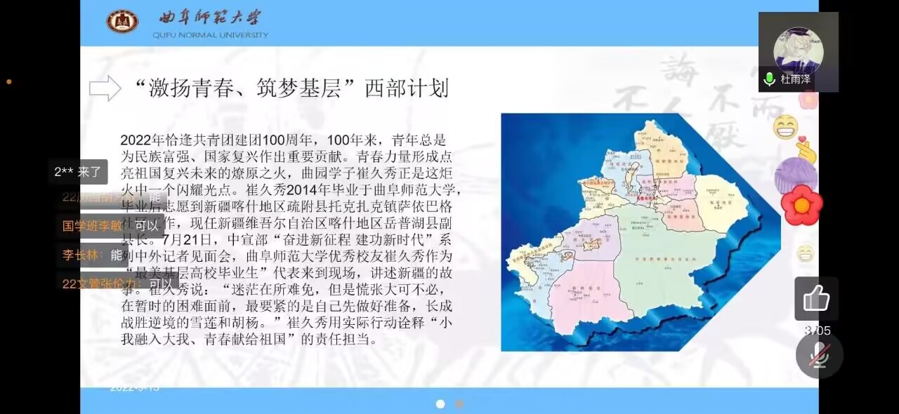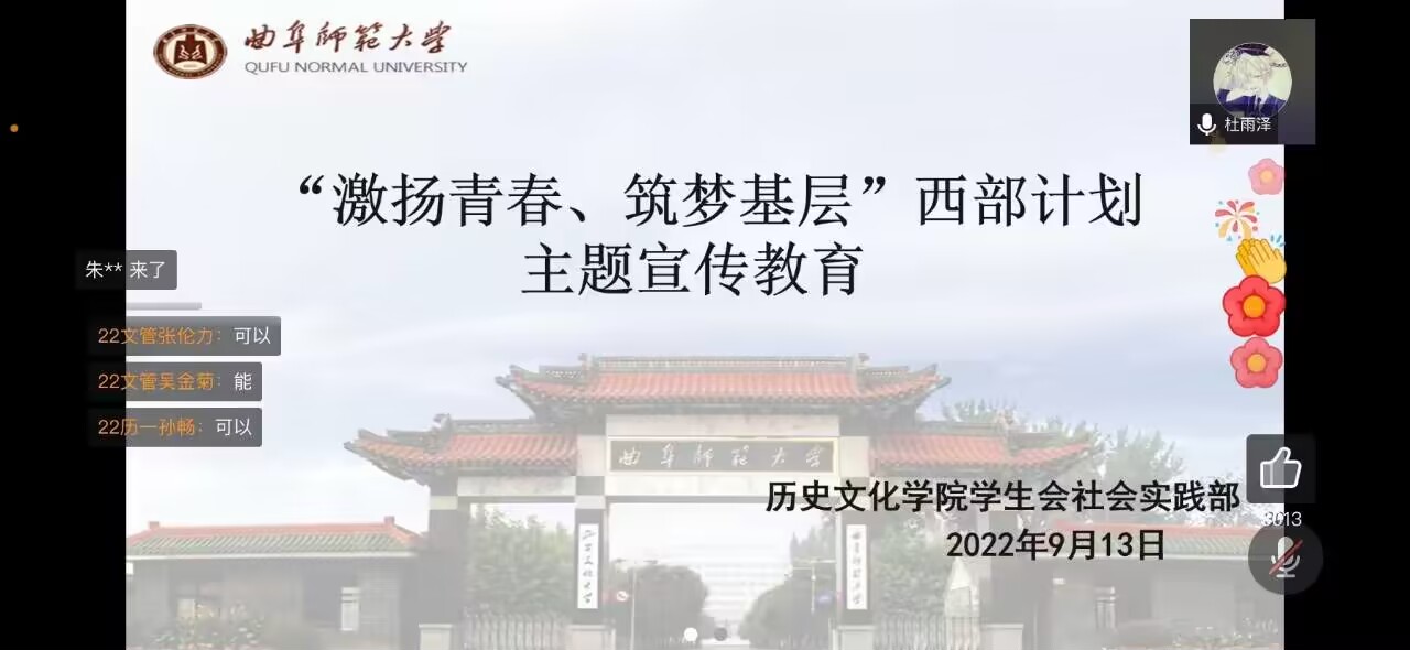 9月13日下午,大乐透 于腾讯会议举办2022级“激扬青春、筑梦基层”西部计划主题宣传教育会议。社会实践部杜雨泽担任主讲人,2022级全体新生参加会议。