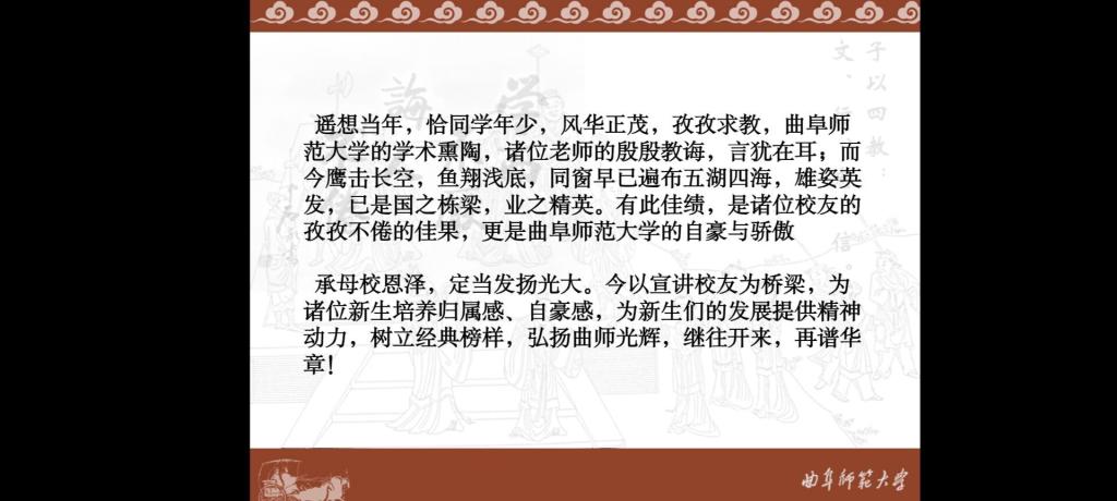 优秀校友宣传讲座的举办,积极弘扬了勤奋朴实、团结进取的曲园精神和犁牛之子的优秀品质。通过讲述校友名人故事的形式,帮助新生感受曲园的名人风采,学习校友精神,建立新同学对曲园的认同感与归属感,激励同学树立远大志向,奋发图强,将小我与大我相结合,再接再厉。