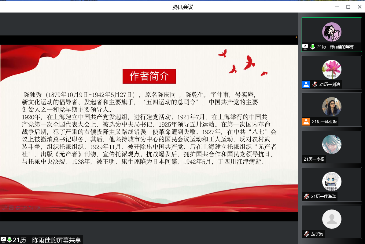 本次读书会围绕《建党以来重要文献选编》中的文章进行介绍,由五位同学通过PPT形式向同学们分享。五位同学分享结束后,在自由讨论环节中,同学们踊跃发言,谈论自己的阅读感悟或疑惑之处,之后由发言人和大家一起讨论解惑。