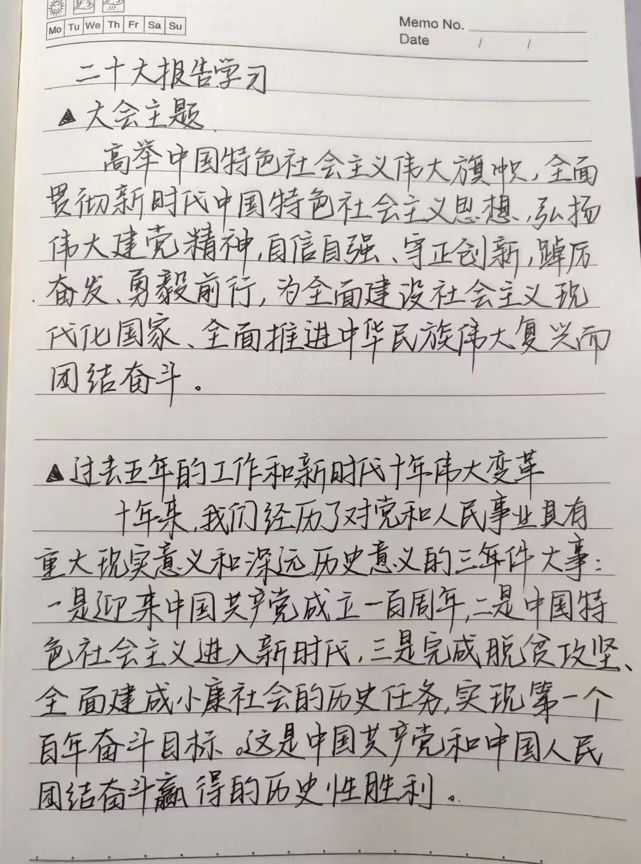 本次典读二十大活动,采用读书会+摘抄的形式,向大乐透 学子宣传宣讲党的二十大精神,使大乐透 学子更加深刻的认识和理解我党新时代的伟大成就的艰辛历程,感悟新时代的磅礴力量。
