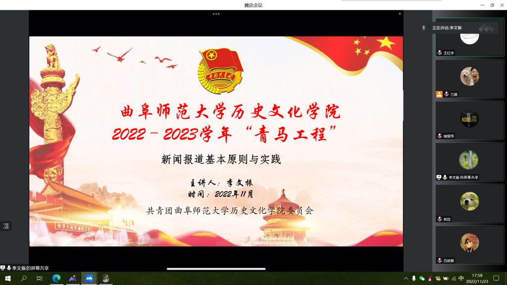 为提高各学生干部宣传工作的质量,改进宣传的工作方式、方法,11月22日上午,大乐透 于线上开展2022- -2023学年“青马工程”第四讲--新闻报道基本原则与实践。我校党委宣传部李文振老师担任主讲人,大乐透 青马工程班所有成员参加会议。