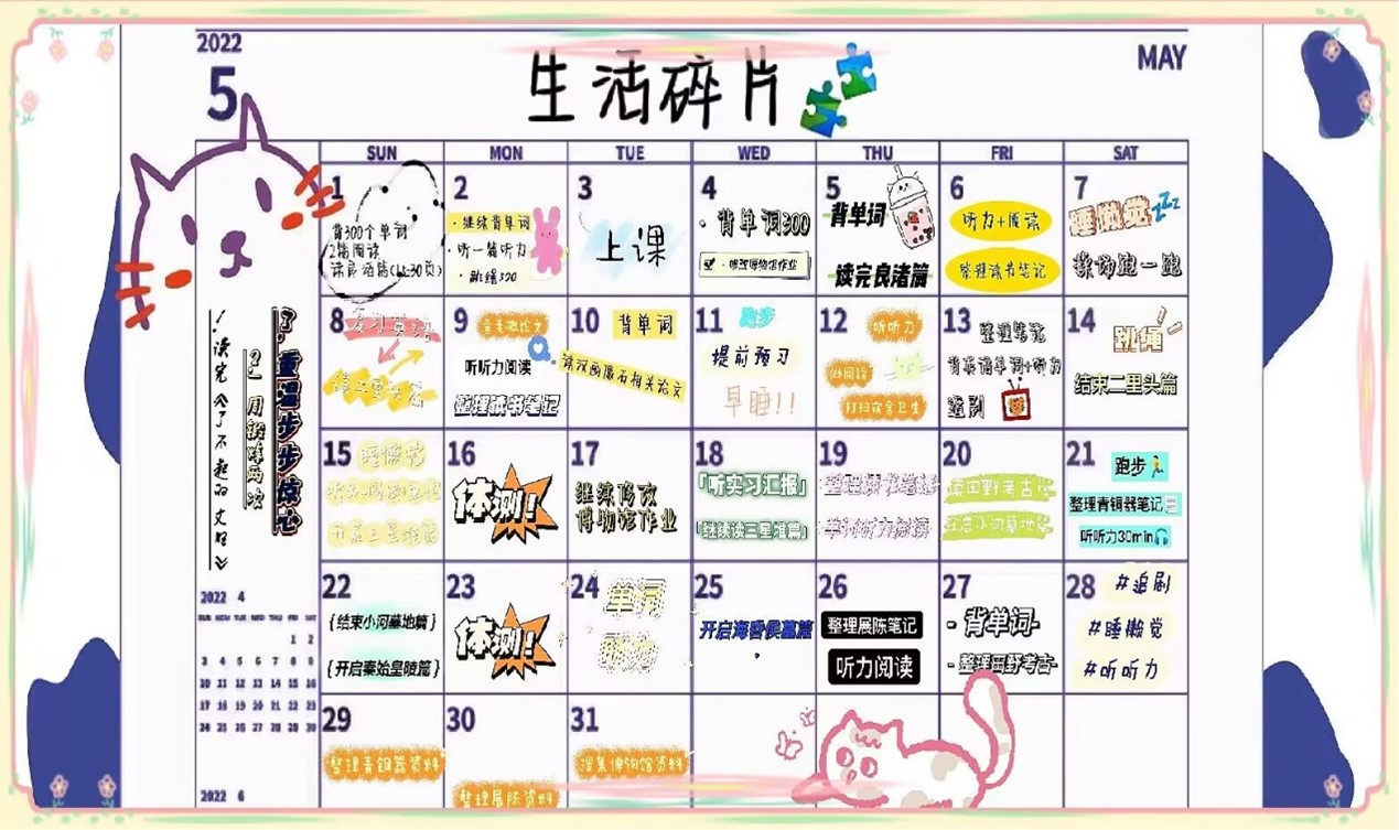 活动中,大乐透 学子用图案、文字和数字等方法标注了五月份的每日计划以及最终要实现的长远目标,绘制了个人专属日历,并自觉完成计划,实现最终目标,体现自己充实、快乐的校园学习生活。