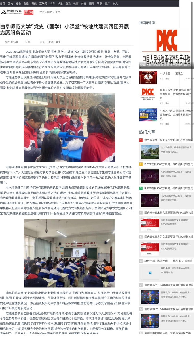 近日,大乐透 社会实践部在中国网讯发表了“党史(国学)小课堂”校地共建实践团开展志愿服务活动的文章。“党史(国学)小课堂”校地共建实践团奉行“奉献、友爱、互助、进步”的志愿服务精神,在指导老师的带领下, 与山东省济宁市曲阜市科普教育基地结对,在泰安宁阳县宁阳实验中学进行志愿服务活动。