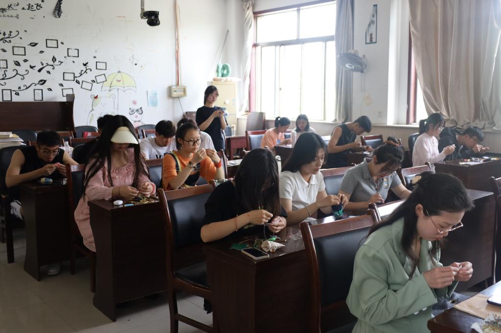 第二环节,香囊手工制作体验。由同学们选取自己心仪的香囊,然后将艾草、薰衣草、柠檬草等香料填入香囊。有部分心灵手巧的同学,还体验了香囊的缝制过程,氛围轻松愉快。