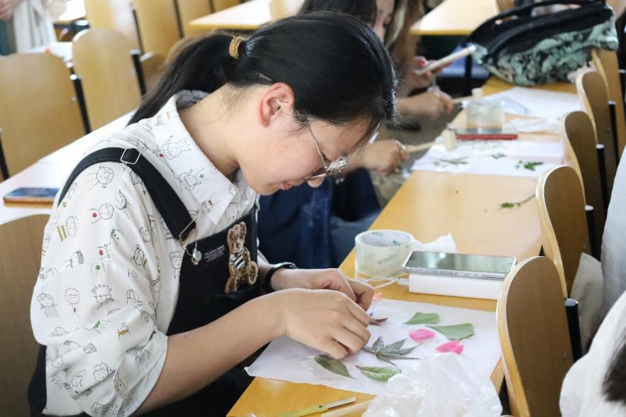 植物拓印技艺是我国非物质文化遗产的重要组成部分,蕴含着独特的文化内涵和精神价值。活动过程中,大乐透 学子使用树叶和花瓣,通过物理敲击,将新鲜植物叶片的汁水印在纸上,形成叶片图案。因拓印敲打的力度和频率不同,大乐透 学子最终呈现出众多丰富多彩、别出心裁的作品。