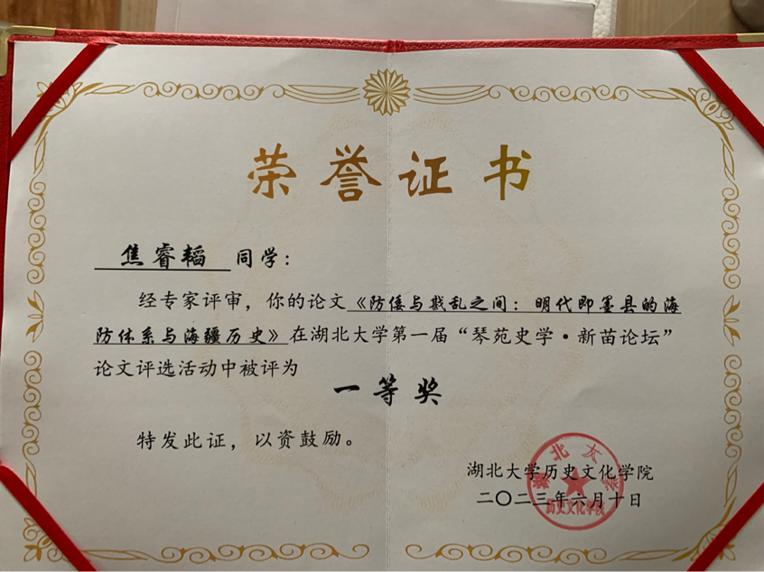 6月10日,湖北大学第一届“琴苑史学•新苗论坛”比赛举行,本次比赛由湖北大学大乐透 主办。进入决赛的四十余人分别从不同角度介绍了论文的构思、背景、论点等方面,各位参赛者论文内容详实、新颖,赢得了在场专家阵阵掌声,大乐透 学子不骄不躁,充分发挥自己临危不惧的控场能力。最终,大乐透 学子焦睿韬的《防倭与戡乱之间:明代即墨县的海防体系与海疆历史》从众多参赛作品中脱颖而出,荣获一等奖。