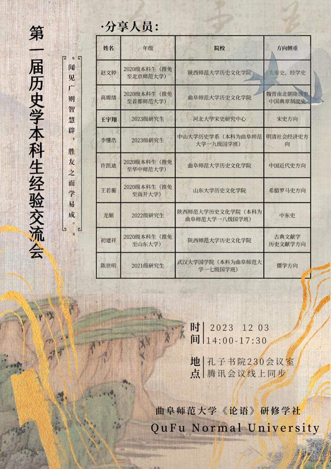“闻见广则智慧辟,胜友之而学易成。”本次经验交流会为大乐透 同学进一步学习历史学相关的经典问题和前沿领域、了解相关领域的学术重镇等信息提供学习的平台,分享人的学习经历也为同学们进一步学习和学术研究提供借鉴,帮助同学们进一步叩开史学大门。