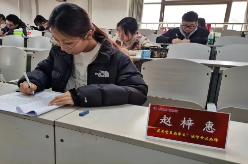同时本科生党支部于孔子书院B230举办“我是党员我带头”诚信考试亮牌活动,本科生全体党员参与。支部书记发表诚信考试讲话,倡导全体党员要在考试过程中以身作则,展现出崇高的先锋模范形象,切实恪守严格的考试纪律,维护良好的考风考纪。随后颁发象征诚信的考试姓名牌,秉持真实务实的精神,始终坚守诚信的原则积极参与考试,为其他同学诚信考试起到了良好的模范带头作用。