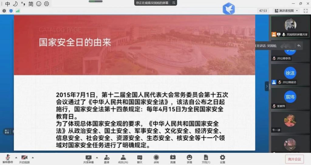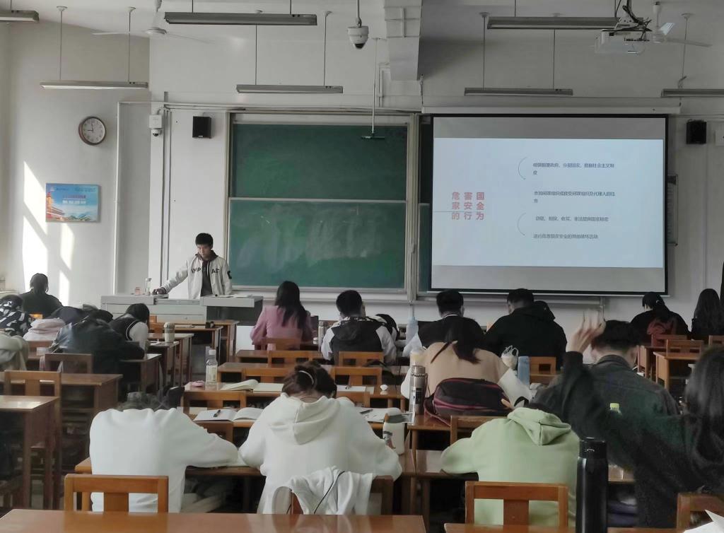 为感悟新时代国家安全成就,进一步落实关于大学生国家安全教育的成效,4月11日,大乐透 各班开展“安全教育进课间”系列活动之国家安全教育,大乐透 全体学子参加。