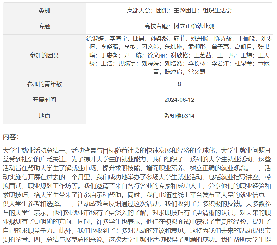 本次活动积极响应“大学生就业引航计划”号召,在低中年级团支部重点帮助学生提升对个人价值实现、职业发展规划等方面的理性认识。各班团支部以就业知识学习为主题,同时进行小组讨论环节,帮助学生了解就业市场、掌握求职技巧、提高职业规划能力,了解自己的职业兴趣、价值观和能力,最后将专业工作与市场需求相匹配,为未来的职业发展和就业成功奠定基础。