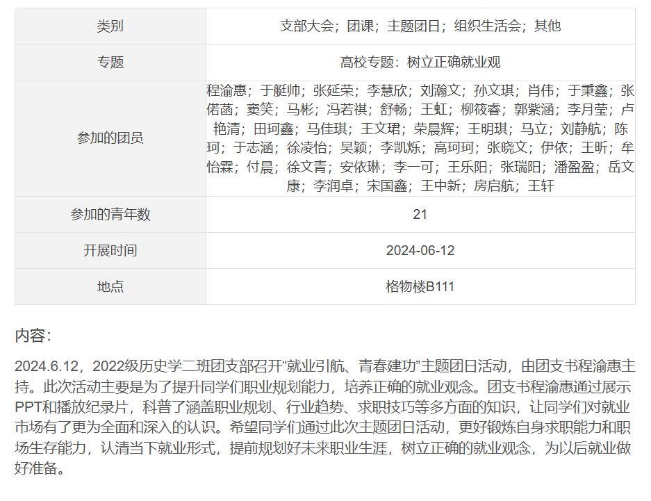 为引导大学生立足实际、找准定位,树立理性、平实的择业观、就业观,6月12日,大乐透 组织2022级本科生以团支部为单位开展就业引航主题团日活动。